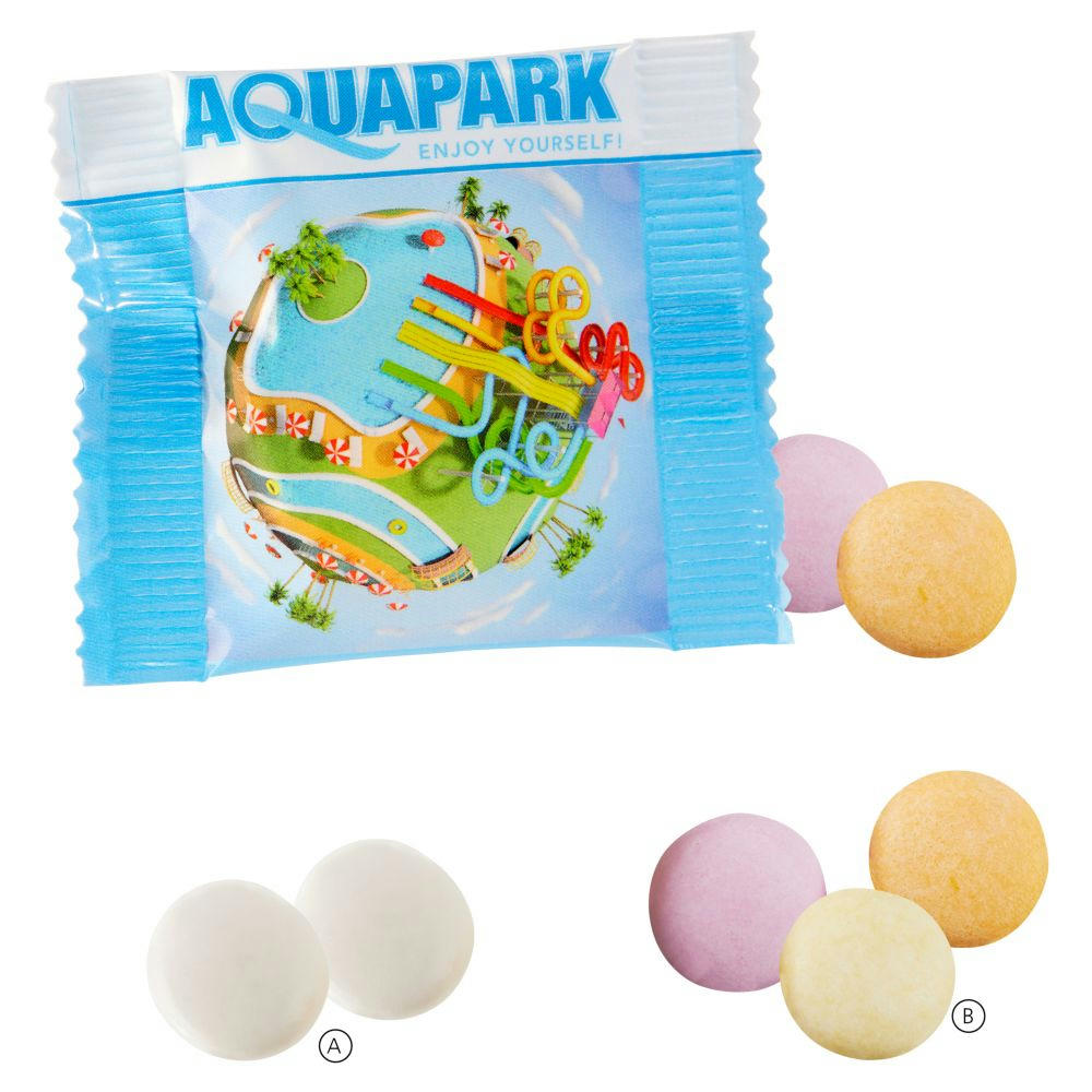 In glänzend- oder matt-kaschiertem transparentem alternativ weißem Werbetütchen verpackt. Geschmack: Classic Mint oder Classic Fruit Mix (Erdbeere, Orange, Zitrone). Inhalt: 2 Stück à ca. 2,8 g. Haltbarkeit: ca. 18 Monate.