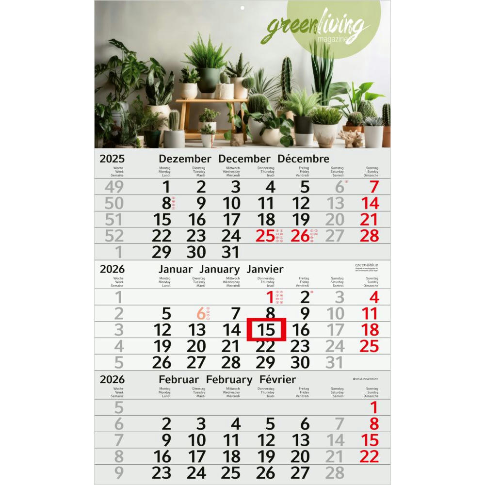 Besonders preiswertes und zugleich umweltschonendes Einstiegsmodell: Einblatt-3-Monatskalender Budget 3 green+blue im kompakten Format; gut leserliches Kalendarium aus Recyclingpapier, mit moderner Typografie; roter Datumsschieber und ideal gelegene Werbefläche am Kopf – individueller Werbeeindruck in 4C-Quality Digital auf dem Kopfteil inklusive