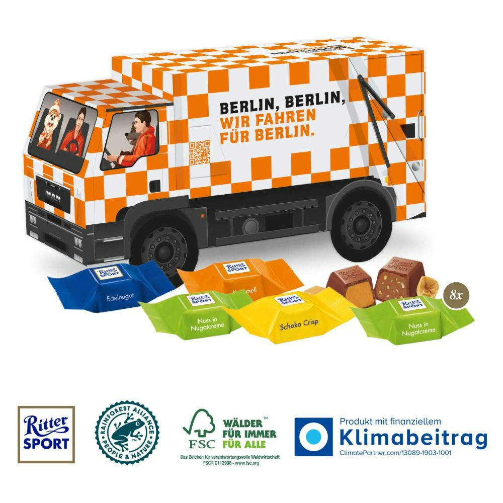 Beliebtes Firmenpräsent zum attraktiven Preis! Die beliebten 3D-Modelle „LKW“ oder „Transporter“ sind individuell in Ihrem Firmendesign bedruckbar. Eine Füllung mit feinster Markenschokolade sorgt für himmlische Genussmomente. Dieses Firmenpräsent findet bestimmt einen Ehrenplatz in den Büros Ihrer Kunden und Mitarbeiter. Produktdetails: Individuelle Präsentverpackung aus hochwertiger Kartonage mit süßer Füllung. Gleich mitbestellen: Einzelversandkarton für den Postversand. Ritter SPORT bezieht Rainforest Alliance-zertifizierten, nachhaltigen Kakao (www.unserkakao.de). // Inhalt: 8 Stück (ca. 64 g) Ritter SPORT Schokowürfel. Geschmacksrichtungen bunt gemischt