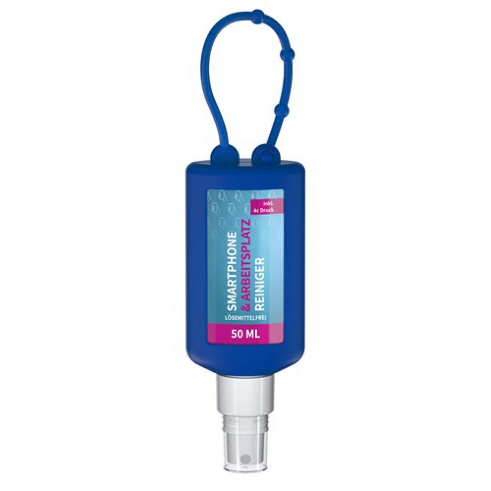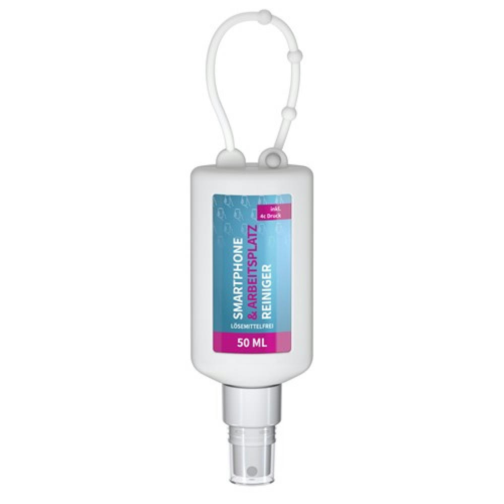 50 ml PET Flasche (weiß) mit weißem Pumpaufsatz und transparenter Schutzkappe; Silikonhülle und Schlaufe in frost. Nachfüllbar. Flasche hergestellt aus 100% recyceltem PET, weiß mit leichter R-PET-Färbung.