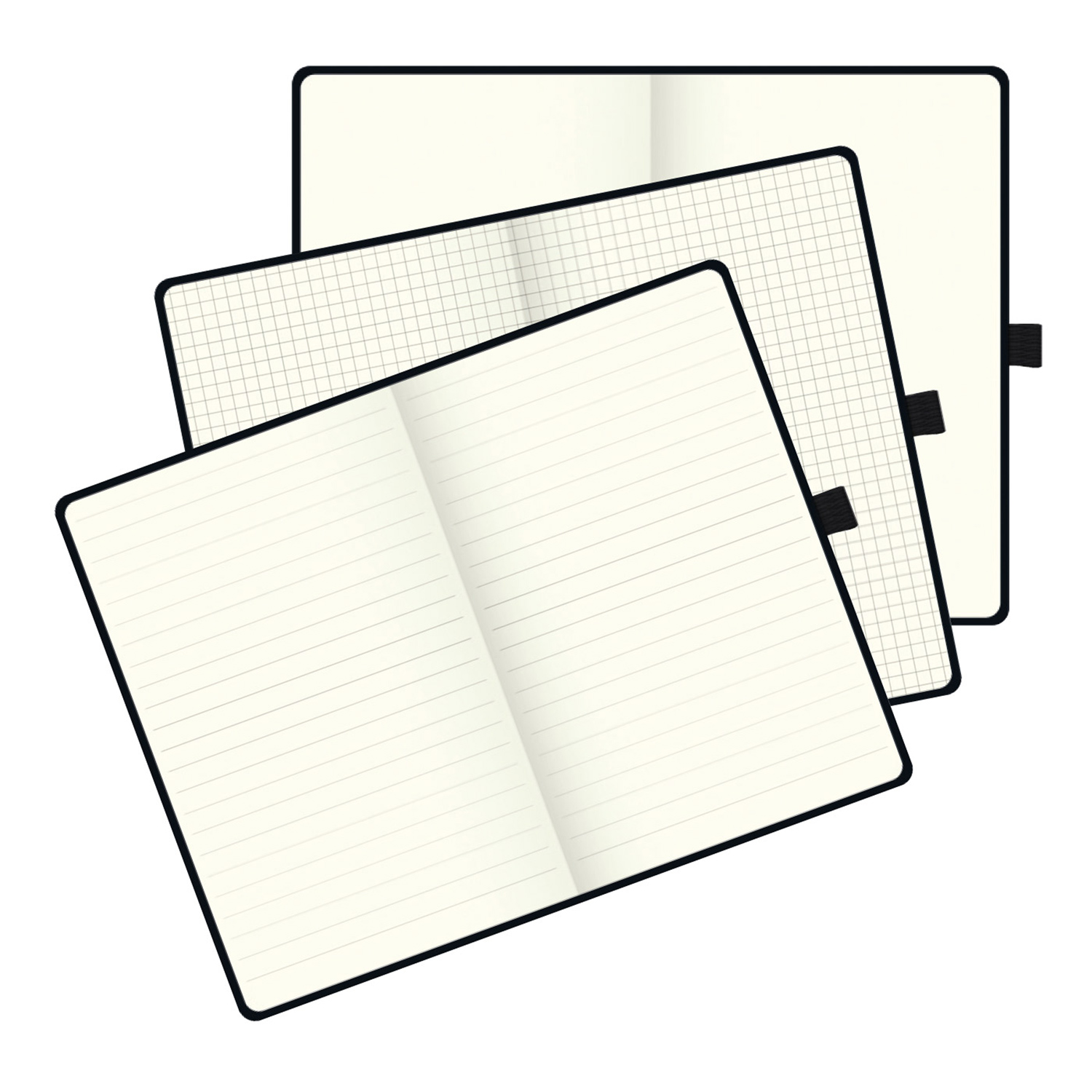 Liniert, kariert oder blanko auf chamoisfarbenem Papier, 192 Seiten Inhalt, mit Zeichenband, Gummizug, Stiftschlaufe und Belegtasche. Preis ab 300 St.
