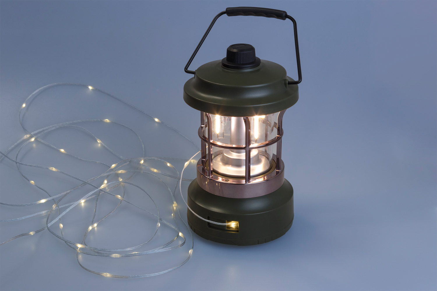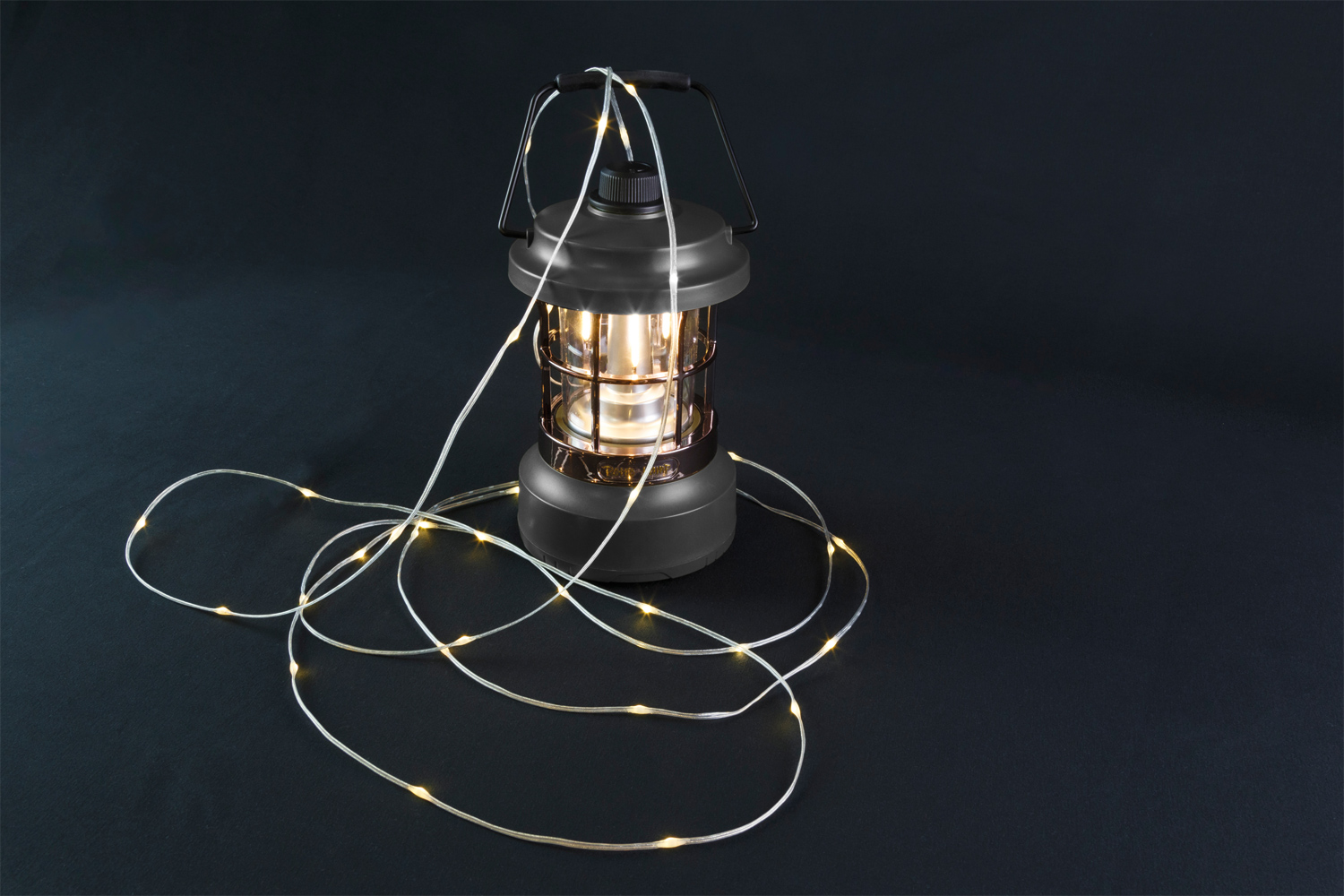 Wetterfest (IPX3) und perfekt für Camping und Garten. Stufenlos einstellbare Lichtintensität und Farbtemperatur. Integrierte 15-m-LED-Lichterkette mit drei Modi. Der 2.000 mAh Akku dient auch als Powerbank für Smartphones.