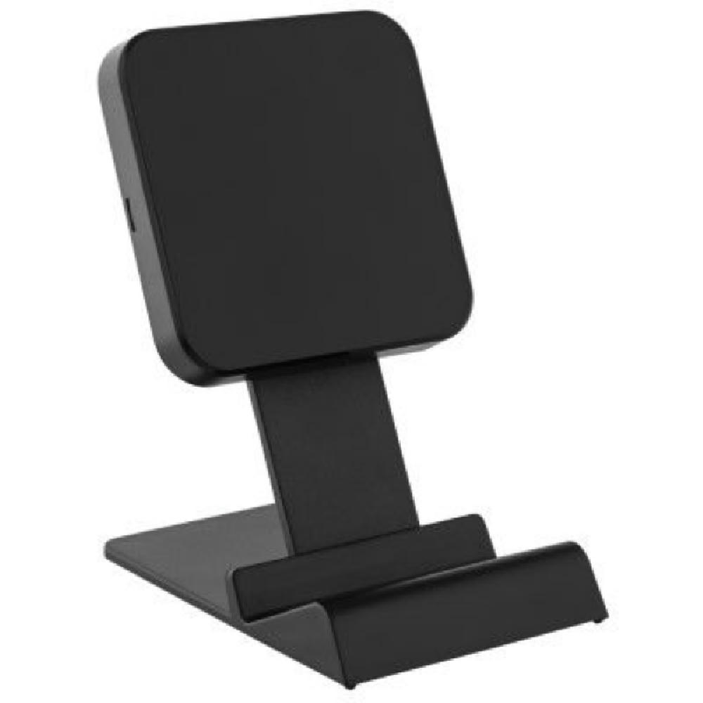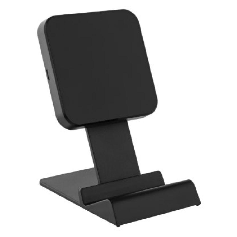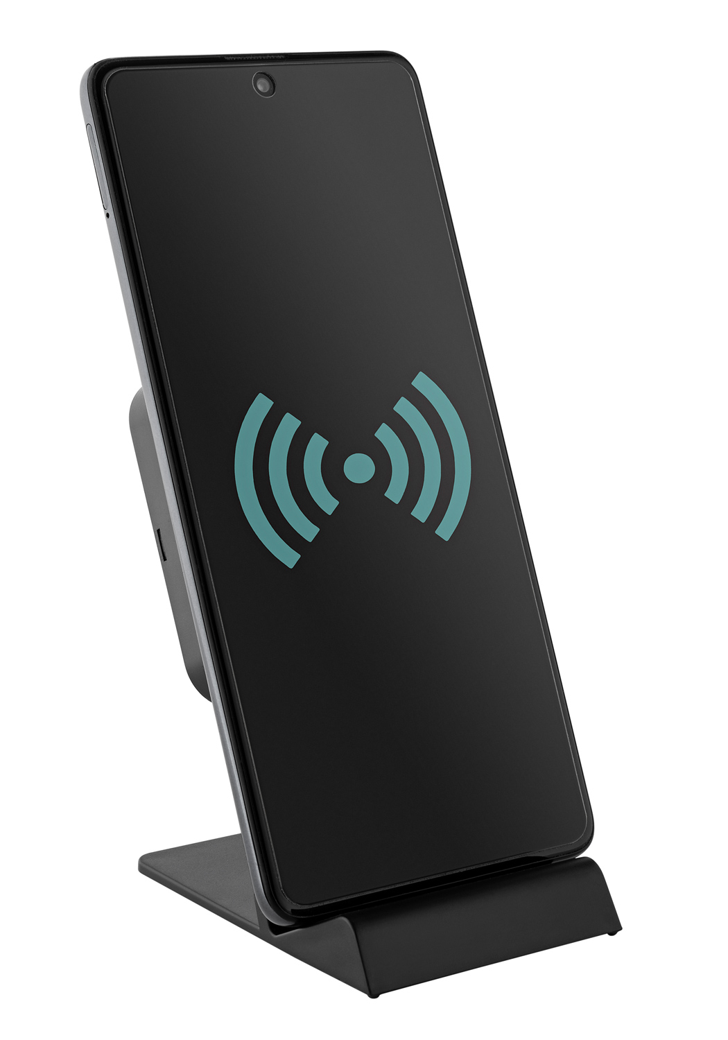 Aufstell Charger für den Schreibtisch, Konsole oder Nachttisch mit starker Induktions-Ladeleistung von 15 Watt. Zu 79 % aus recyceltem ABS hergestellt. Prominente Werbefläche, höhenverstellbar, kompakte Bauform. Inkl. Ladekabel, in Designbox.