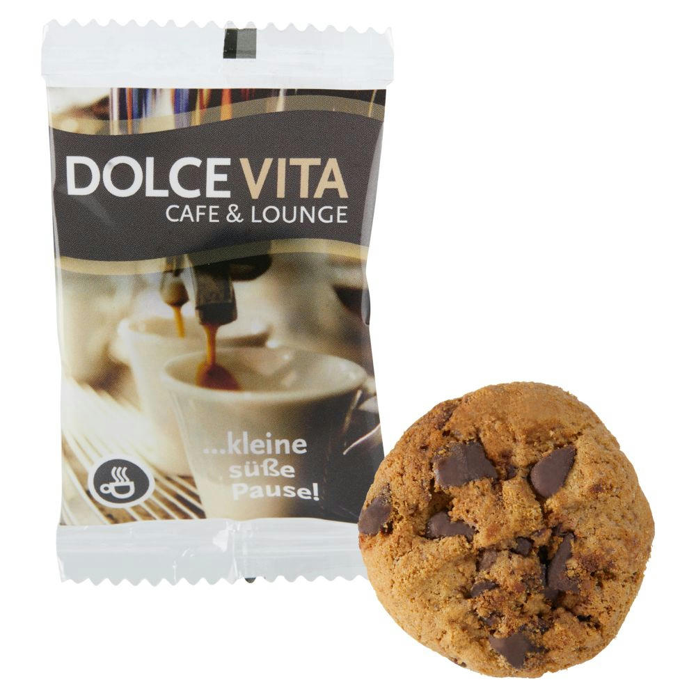 Mürbegebäck mit Vollmilch- und Zartbitter-Schokoladenstückchen (40 %) in glänzend- oder matt-kaschiertem transparenten (alternativ weißen) Flowpack einzeln verpackt. Bruch einzelner Kekse möglich. Maße: ca. 9 x 5 cm, Inhalt: 1 St. à ca. 6,4 g. Haltbarkeit: ca. 9 Monate. Preis inkl. 1-5c-Druck