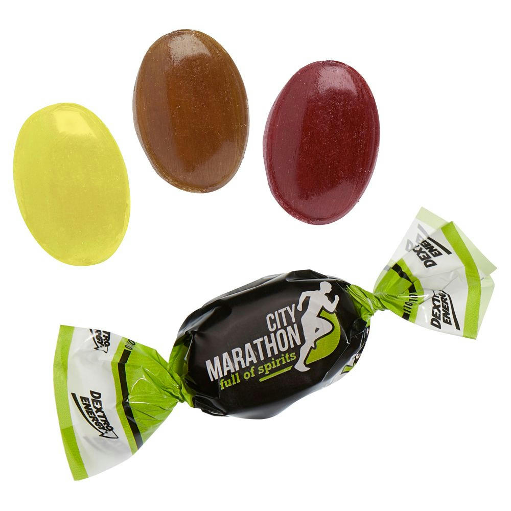Energielieferndes Bonbon mit Dextrosefüllung und Vitamin C im Werbewickel aus glasklarem (alternativ weißem) Zellglas einzeln gewickelt. Geschmack: ab 25 kg: Zitrone, ab 500 kg: Cola oder Cassis. Inhalt: ca. 4,6 g/Stück, Maße: 6 x 2 cm, Haltbarkeit: ca. 18 Monate. Preis ab 25 kg inkl. 1-5c-Druck (Preis pro kg)