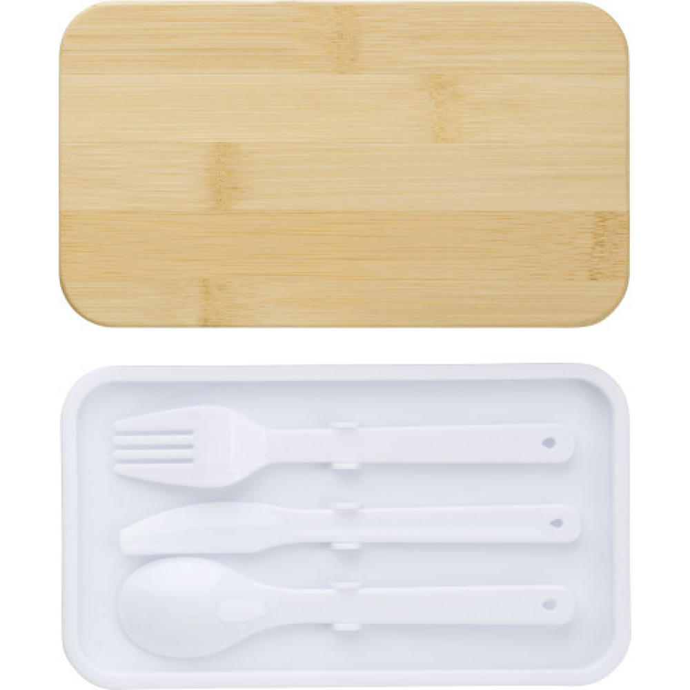 Doppellagige PP-Lunchbox mit mehreren Fächern (2 x 400 ml) und Bambusdeckel. Inklusive Trennwand und Plastikbesteck (Löffel, Gabel und Messer) und Gummiband.