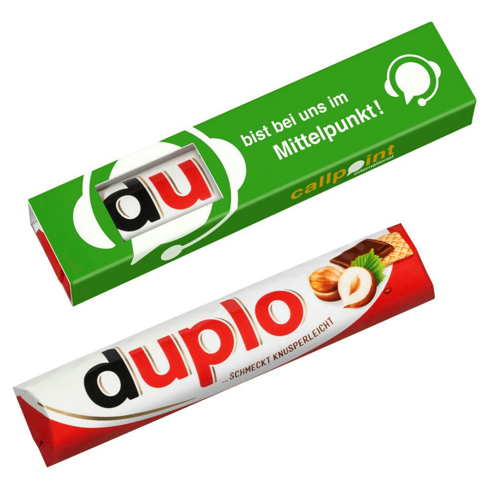 Der Duplo Einzelriegel ist ideal für den spontanen Genuss zwischendurch. Eine locker-leicht gebackene Waffel mit zartschmelzender Creme und leckeren Haselnüssen geben Duplo den extra knusprig, klassischen Geschmack. In Originalverpackung mit Werbeschuber mit Sichtfenster. Haltbarkeit: ca. 3 Monate. Inkl. Druck.
