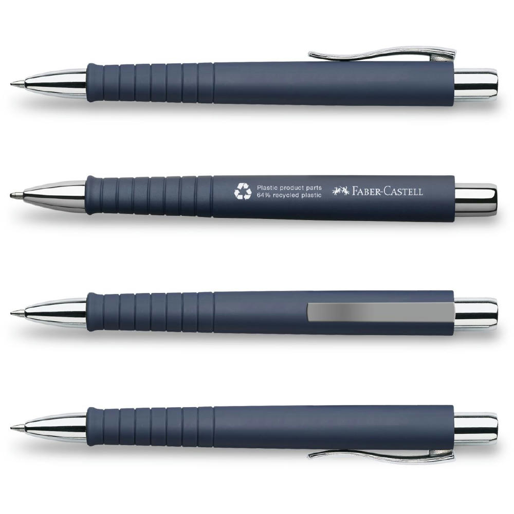 Kugelschreiber mit Schaft aus recyceltem Kunststoff in ergonomischer Dreikantform mit Soft-Touch Oberfläche, verchromter Kunststoffclip. Metallgroßraummine blau / XB, dokumentecht. Preis inkl. 1c-Druck. Farbe: dunkelblau, weiß, schwarz.