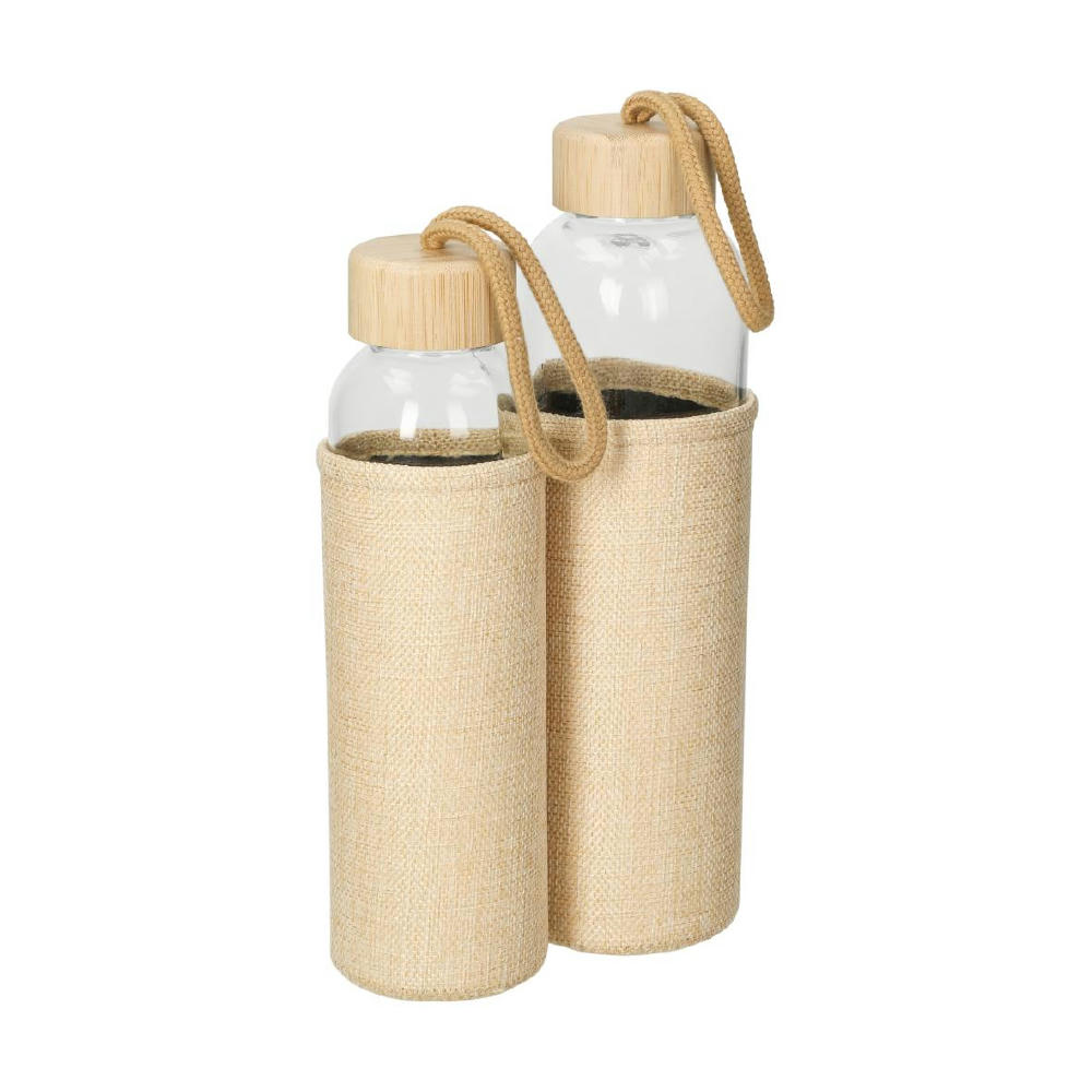 Handliche Trinkflasche aus Sodalime-Glas inklusive Schraubverschluss aus Bambus mit praktischer Schlaufe. Die griffige Hülle in natürlichem Look hält die Temperatur des Getränks länger konstant. Außerdem bietet sie bei heißem Inhalt zusätzlichen Schutz vor der erwärmten Oberfläche. Füllmenge: 0,50 Liter.