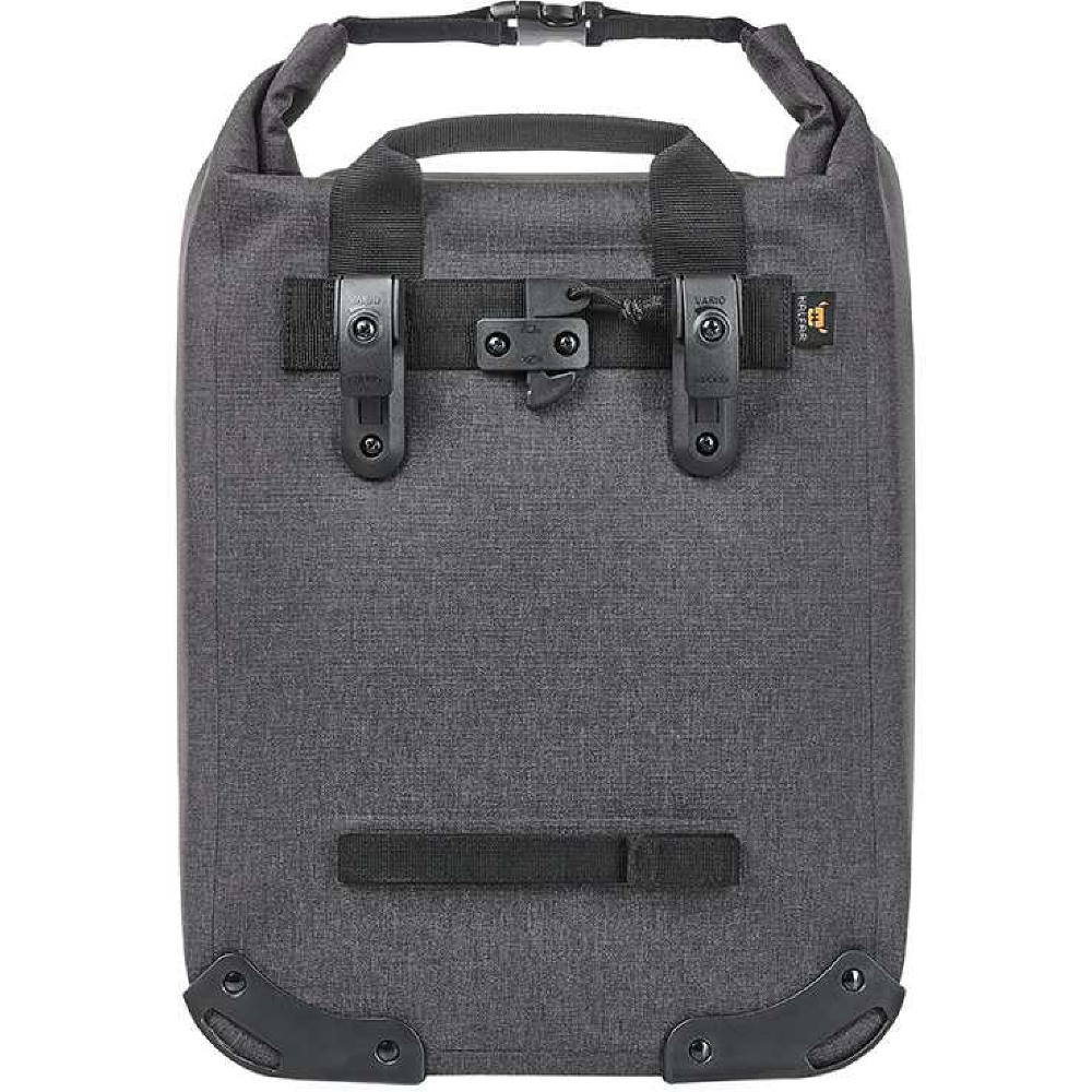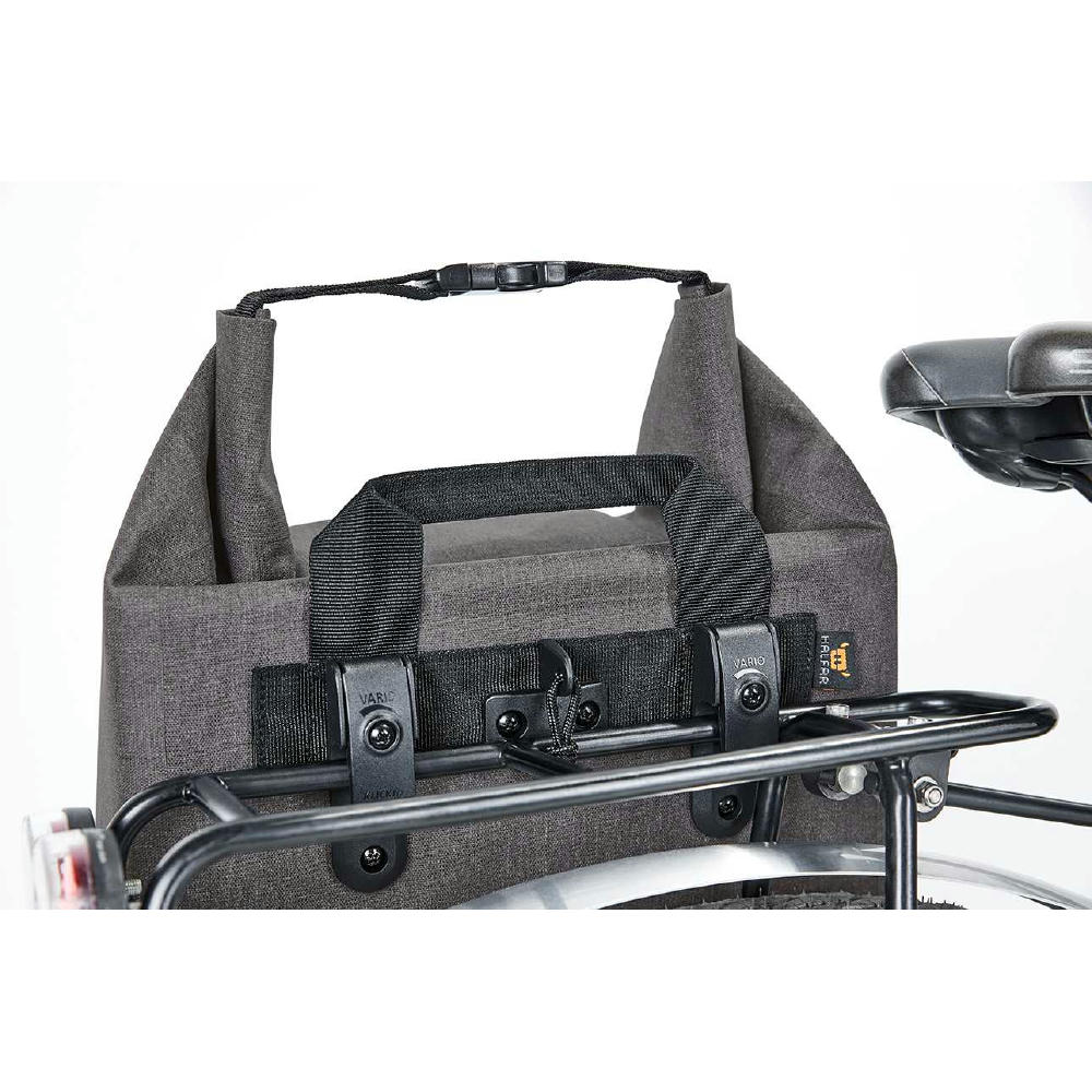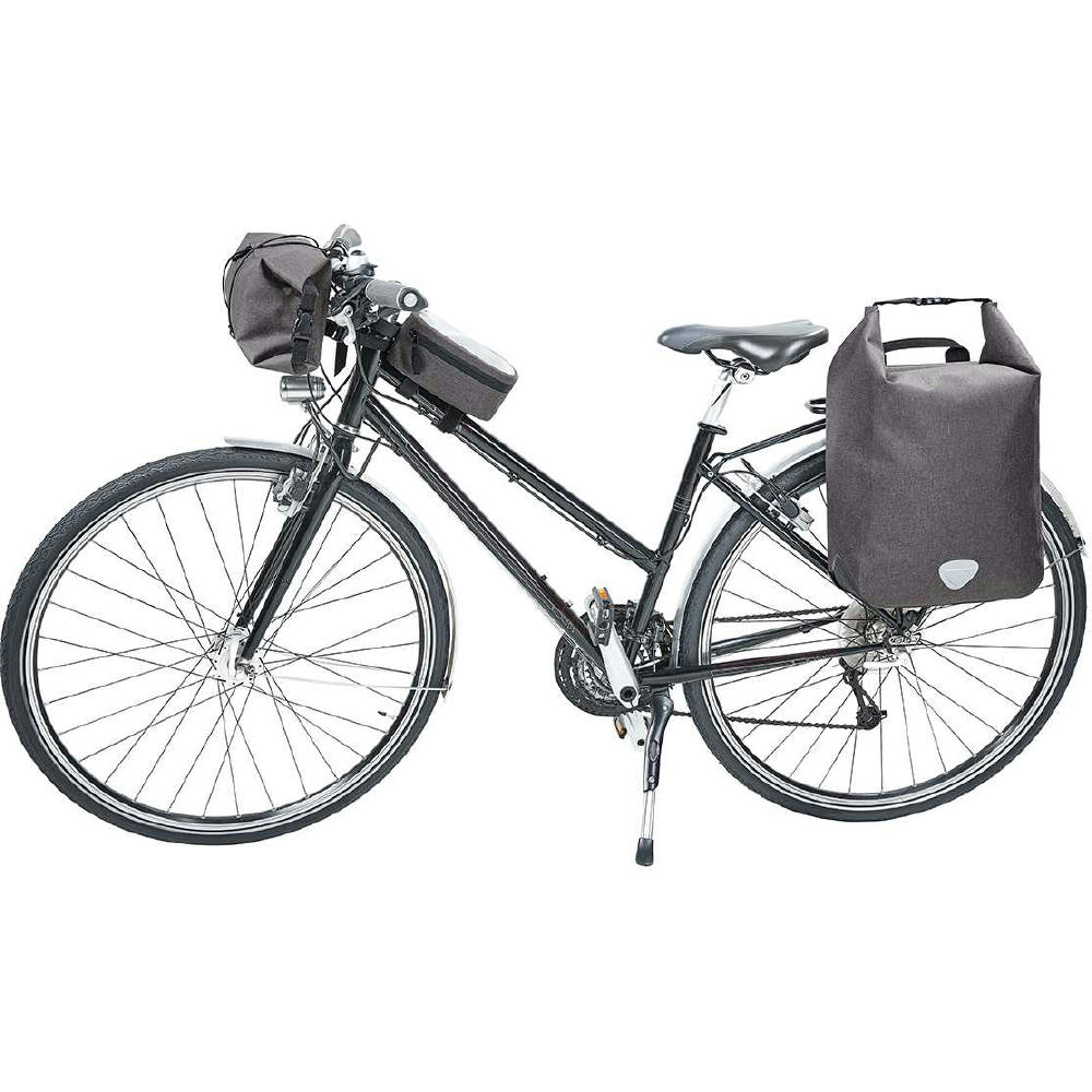 Urbane Fahrradtasche mit geräumigem Hauptfach; große Reißverschluss-Innentasche; Rolltop-Verschluss; geschweißte Nähte für zuverlässigen Schutz vor Regenwasser und Nässe; Boden- und Kantenschutz; individuell einstellbare Halterung zur Befestigung am Fahrrad-Gepäckträger mit Drehriegel zur Sicherung und Klettverschluss auf der unteren Taschenrückseite für zusätzliche Fixierung; dekorative Reflektorapplikation; Handgriff.
