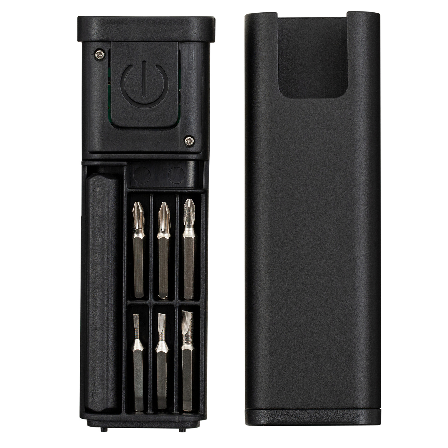 Die Leuchte ist 80 Lumen stark und über einen leicht bedienbaren An/Aus-Knopf zu steuern. Das rechteckige Kästchen aus eloxiertem Aluminium lässt sich aufschieben und enthält sechs Bits und einen Bithalter. Enthalten sind jeweils drei verschiedene Größen eines Kreuz- und Schlitzschrauben-Bits. Inkl. Gürtelclip.