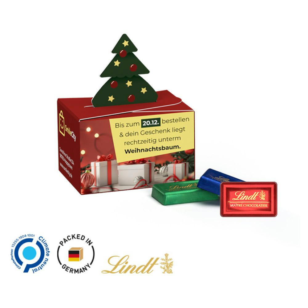 Lindor Milchkugel in einer Werbebox aus weißem Karton, Verschluss mit einem aufgestellten Tannenbaum, Box individuell bedruckt. Inhalt: 1 LINDOR Milchkugel, 12,5 g. Saisonartikel - solange der Vorrat reicht!