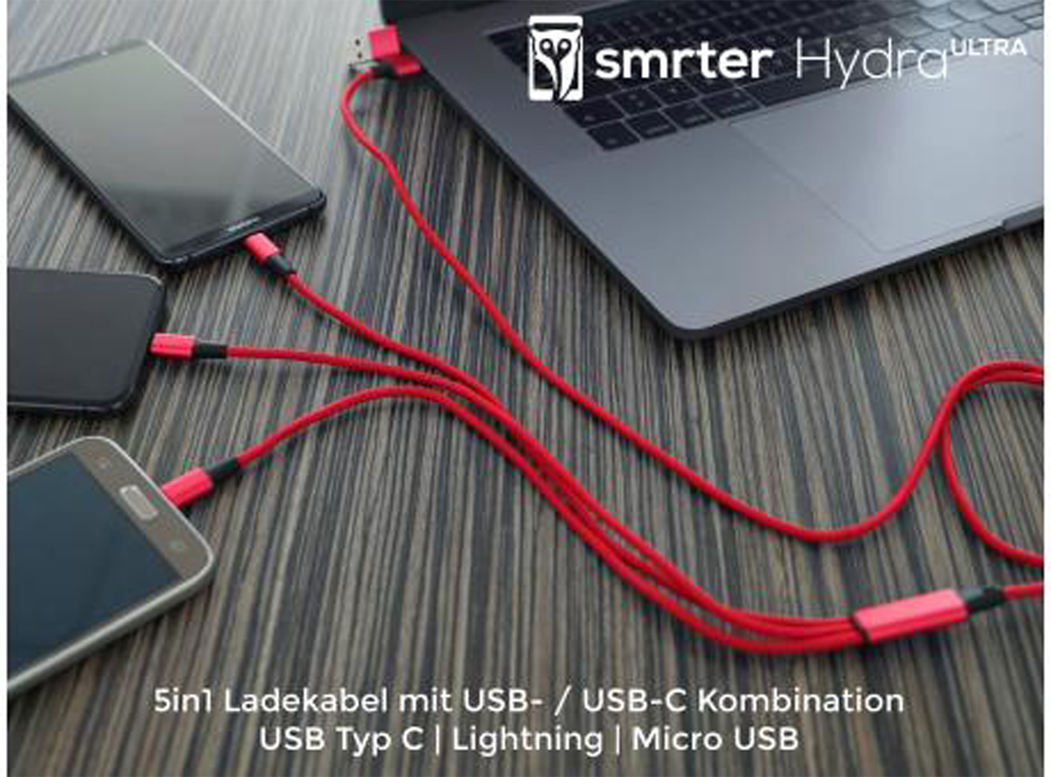 120cm langes Ladekabel aus robustem Aluminium und Nylon. Anschlüsse: Apple Lightning (non MFI), Micro-USB, USB Typ C USB 2.0/USB-C. Der Ladestrom von bis zu 3A sorgt für einen raschen Ladevorgang und ermöglicht sogar das gleichzeitige Aufladen von drei unterschiedlichen Geräten. Um für alle Anschlussarten perfekt gerüstet zu sein besitzt das Hydra ULTRA zusätzlich einen speziellen USB/USB-C Kombianschluss und kann somit an jeder herkömmlichen USB und an jeder neuen USB-C Buchse angeschlossen werden. Optional gegen Aufpreis ab 500 St. Gehäuse und Kabel individuell nach Pantone.