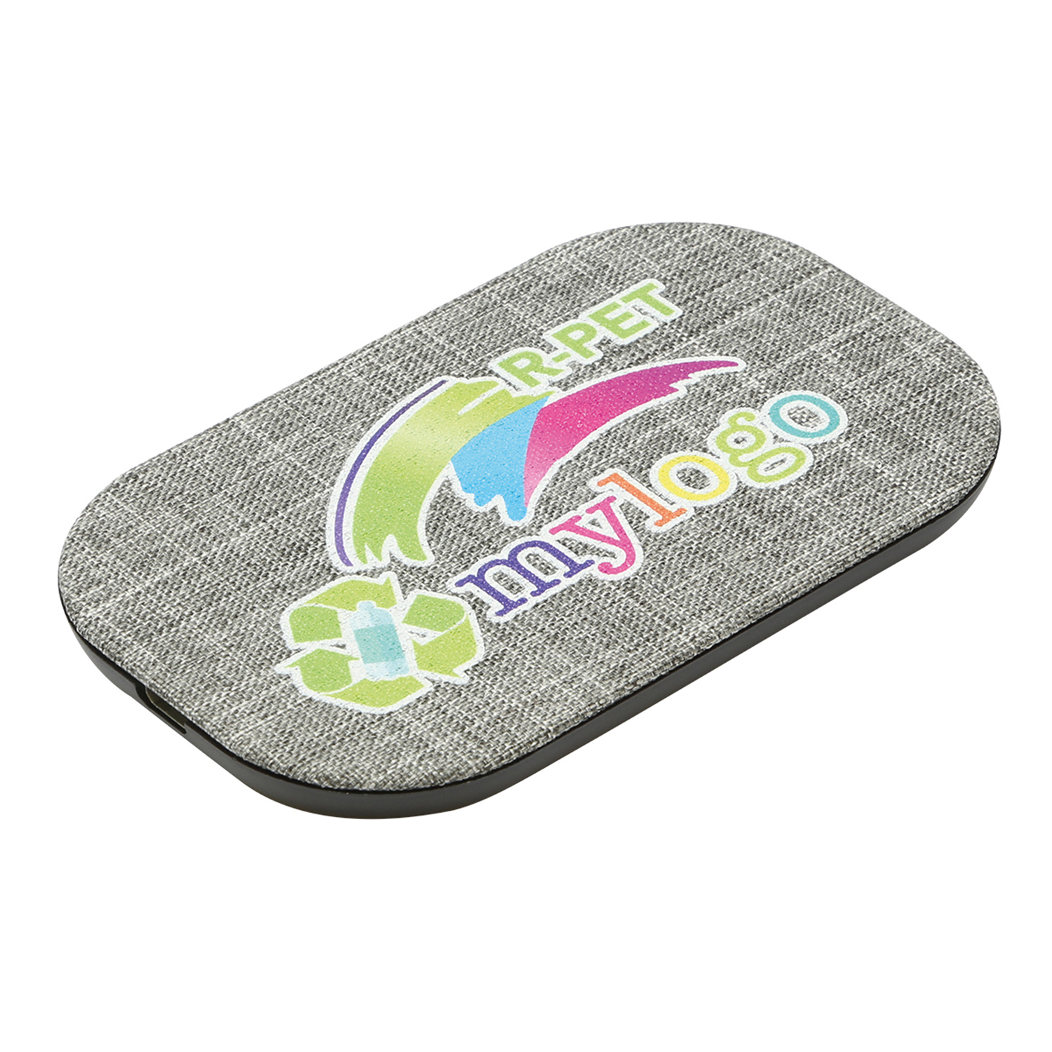 Kabelloses Laden mit der aus 1,5 1-Liter recycelten PET-Flaschen gefertigten rPET TEX QI-Ladestation mit hellgrauer textiler Oberfläche. / USB auf Micro USB-Ladekabel im Preis enthalten / Leistung 10 Watt = 2A / Material: rPET / Output: 5V = 2A / verpackt im braunen Recycling-Karton.