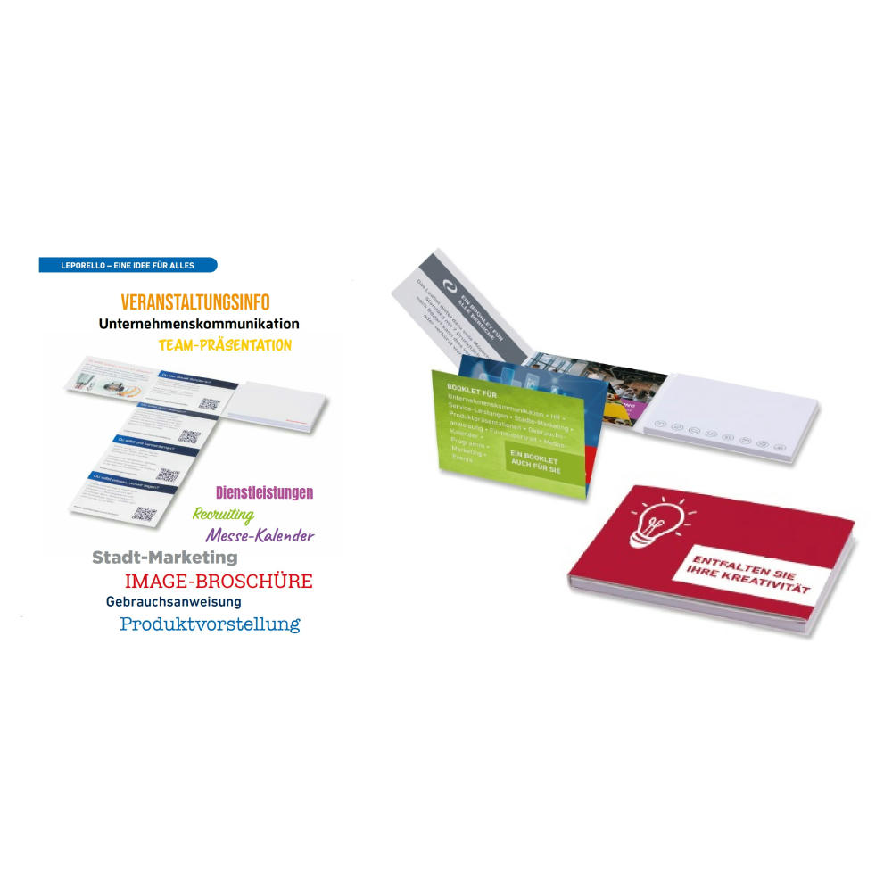 Kartoncover-Leporello seitlich zu öffnen, mit Haftnotizen + Leaflet.Haftnotizen innen rechts mit 50 Blatt 10 x7,5 cm, weiß, 80g und 2-farbigem Druck, einseitig. Leaflet gefaltet mit 7 Druckflächen à 10 x 7,5 cm, Bilderdruckpapier 130g und 4-farbigem Druck, beidseitig. Kartoncover mit 4-farbigem Druck. Einzeln mit Banderole verschlossen.