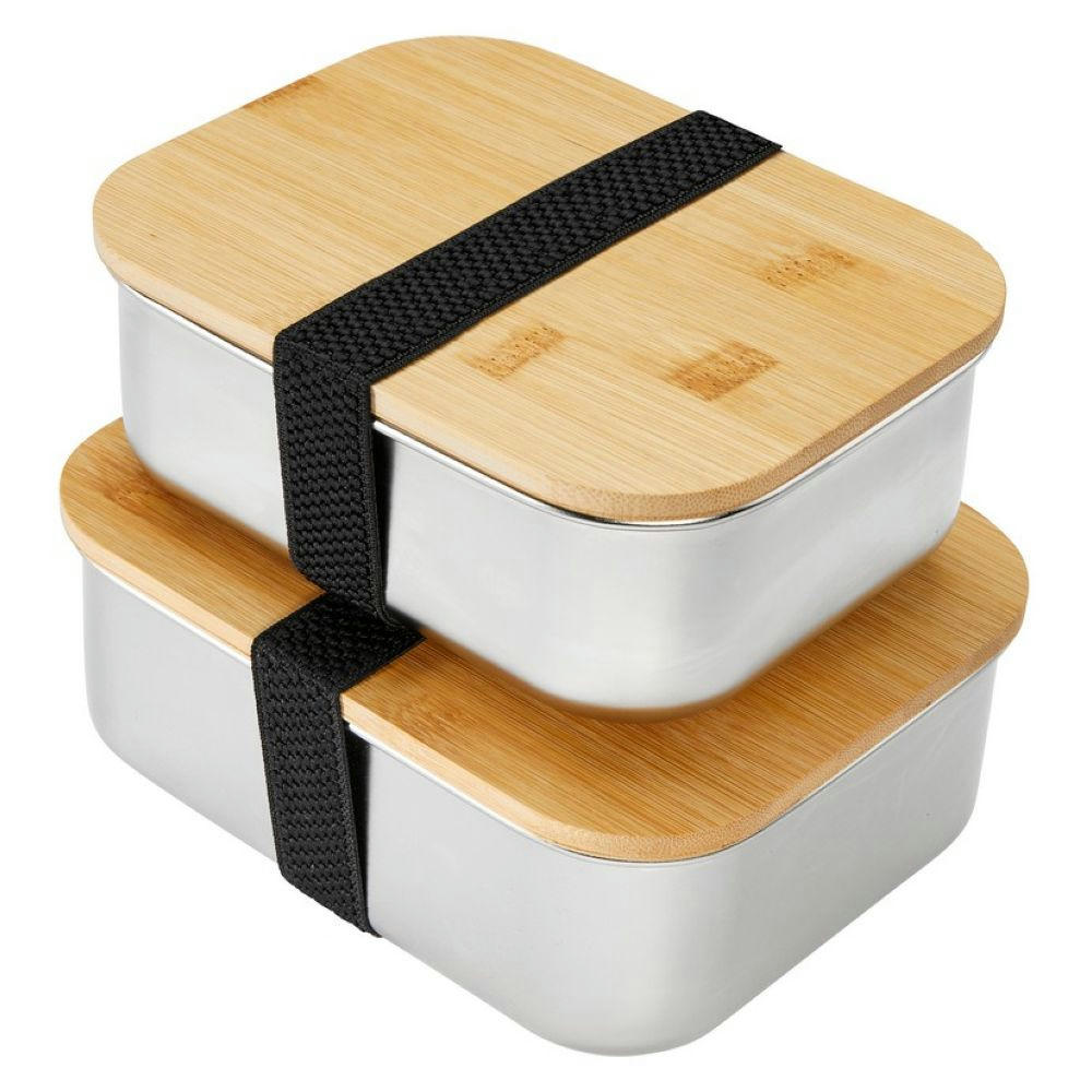 Edelstahl-Lunchbox 1,35L mit Bambusdeckel und elastischem Halteband. Spülmaschinengeeignet (mit Ausnahme des Deckels). Auch in der Größe S /1,0 L erhältlich.