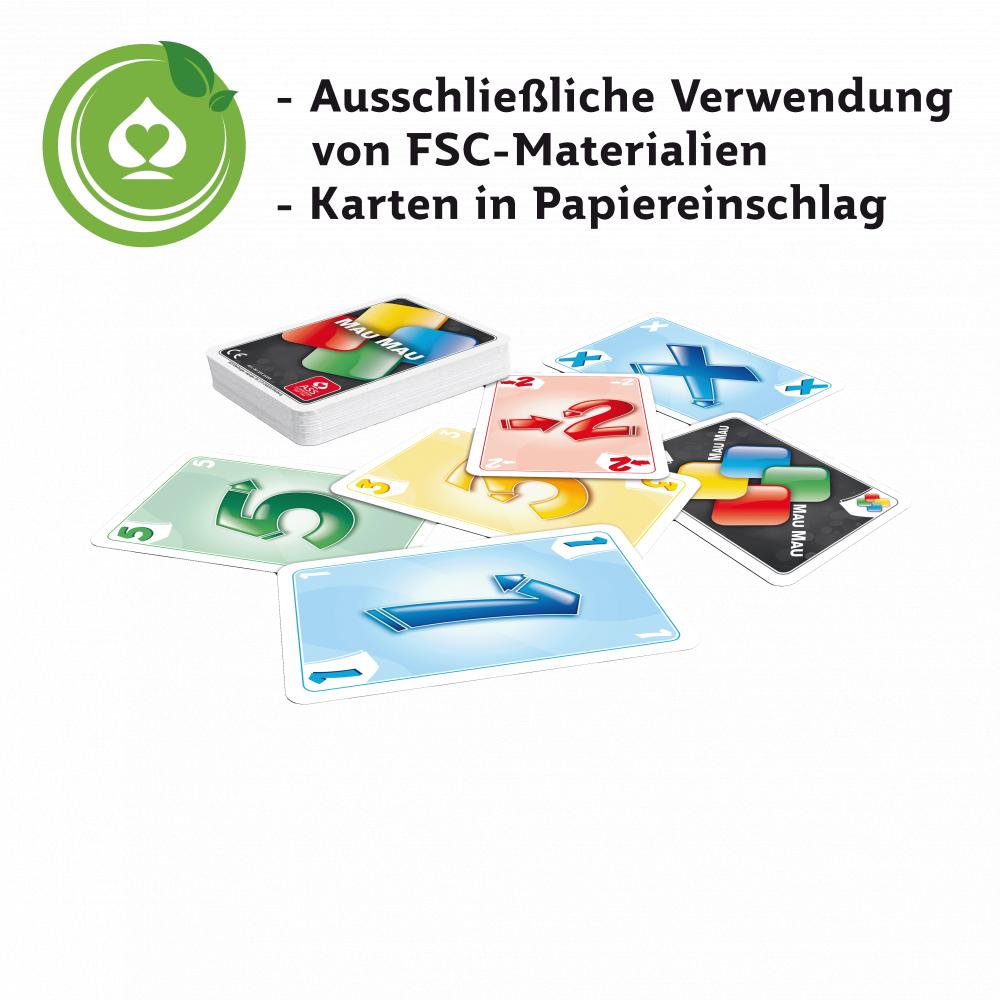MauMau - das grenzenlos verrückte Spiel für Jung und Alt; 55 Blatt in Faltschachtel mit individueller Vorder- und Rückseitengestaltung bzw. unserem Vorderseitenmotiv und Ihrer Werberückseite; Umfang: 55 Karten inkl. Spielregelkarten.