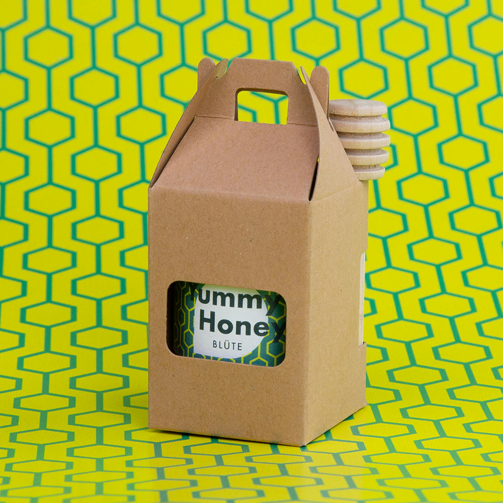 Raffinierte, kleine Faltbox mit praktischem Träger und Sichtfenster wird mit einem #mini Glas Blütenhonig zum aromatischen Überreichungs-Set. Das seitlich integrierte Honiglöffelchen sorgt dabei für das richtige Maß. Durch das Sichtfenster sticht Ihr individuell gestaltetes Etikett sofort ins Auge. Preis inkl.4c-bedrucktem Etikett auf dem Honigglas.