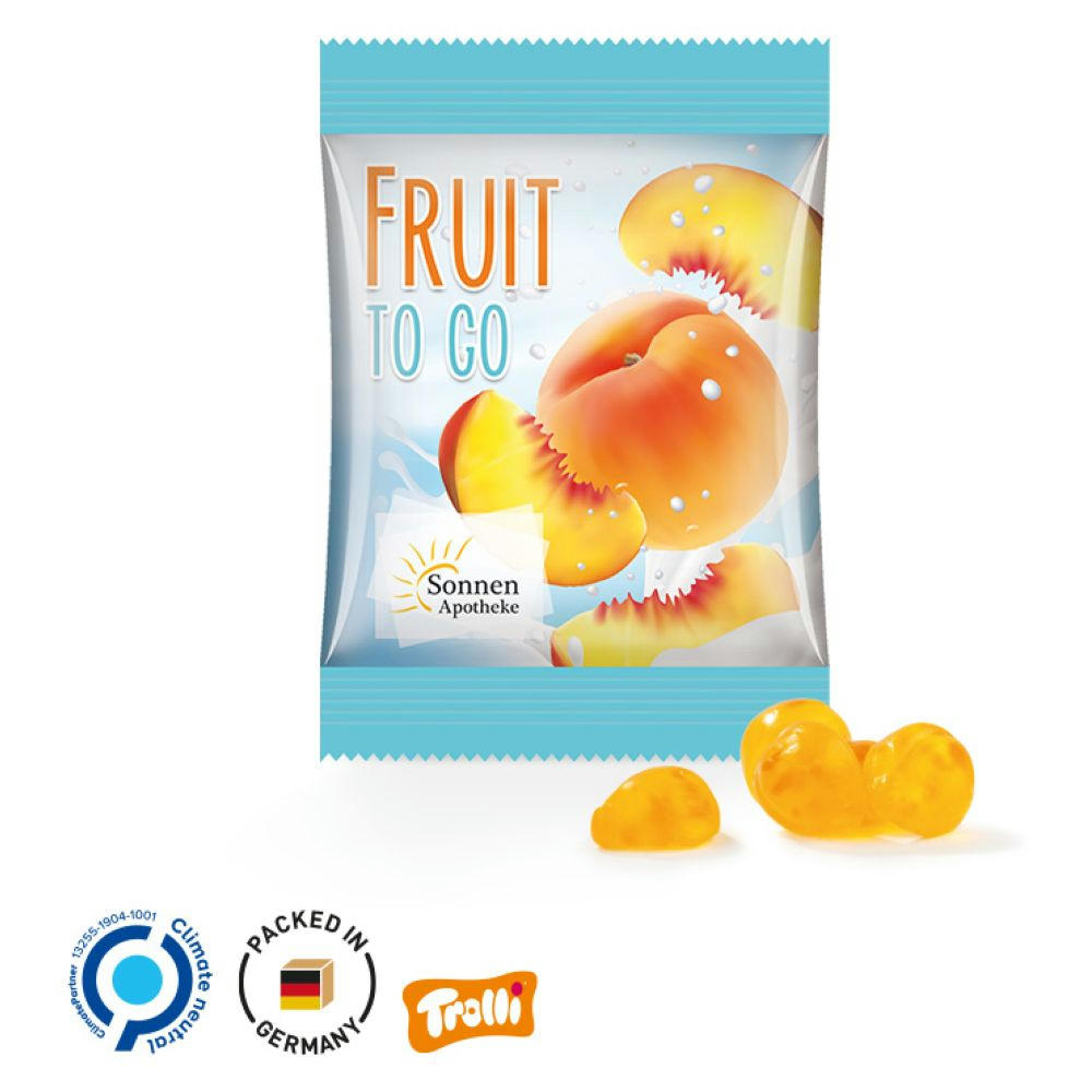 Trolli Fruchtgummi in Tüte aus weißem, recyclingfähigem Papier, individuell bedruckt. Inhalt: Trolli Vitamin-Fruchtgummi, mit Fruchtsaft, fruchtigen Stückchen und 10 Vitaminen, in der Geschmacksrichtung Pfirsich, 15 g.