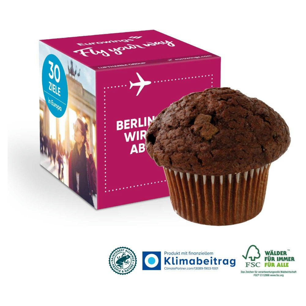 Muffin Choco oder Vanille in einer individuellen Werbekartonage. Mit oder ohne Herzausstanzung. 1 Muffin, Rainforest Alliance-zertifiziert (ca. 55 g) in Aroma-Schutzverpackung. Geschmacksrichtungen: Vanille-Schoko oder Schoko.