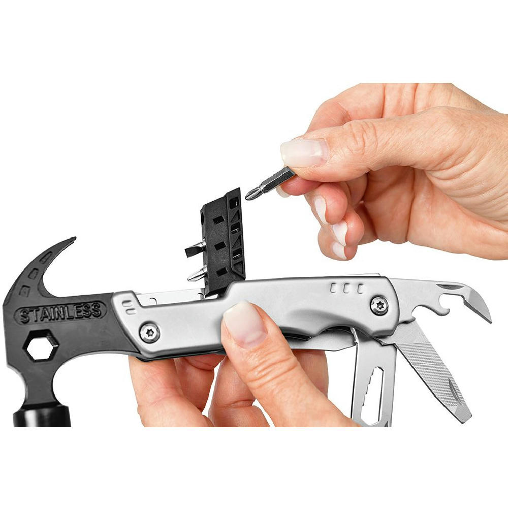 Werkzeuge: Schraubendreher Bithalter, Klaue mit Nagelheber, Bithalter mit Magnet, Schraubenschlüssel (12 mm), Hammer, Kronkorken-Heber, Dosenöffner, Abisolierer, Feile, Schlitzschraubendreher (6,5 ), Schraubenschlüssel (5/ 6/ 7/ 8/ 9 mm), Stemmwerkzeug, Messer (Klingenlänge 80 mm).