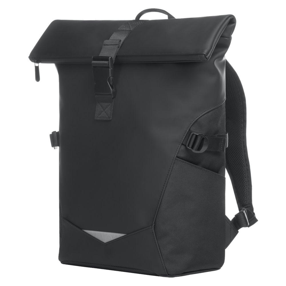 dynamischer Rolltop-Rucksack; Reißverschluss-Hauptfach mit Steckverschluss; große Reißverschluss-Vortasche; zwei seitliche Einsteckfächer; Fixiergurte; dekorativer Reflexeinsatz auf der Front; innen gepolstertes Einsteckfach mit Klettsicherung; verstecktes Reißverschluss-Fach rückseitig; aufwändig gepolstertes Tragesystem mit individuell einstellbarem Brustgurt; Hand- sowie Tragegriff