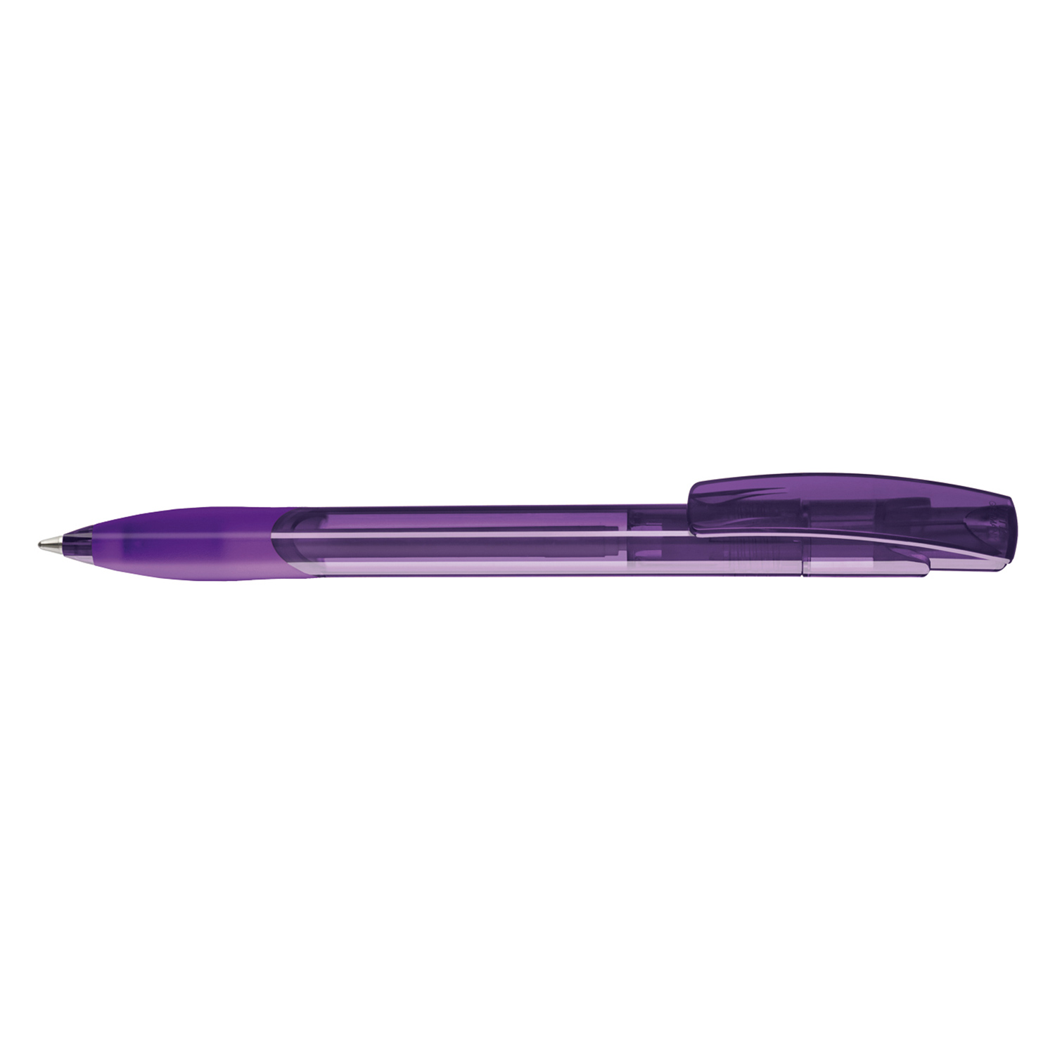 Druckkugelschreiber mit transparent glänzendem Schaft, Gummigriffzone und Clipdrücker.