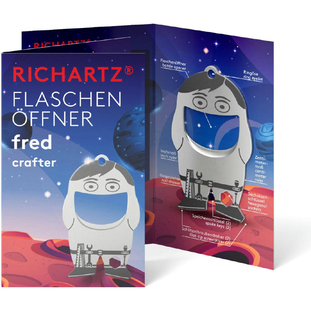 Der sympathische Flaschenöffner überzeugt durch seine schöne, kompakte Form und passt daher an jeden Schlüsselbund. Sein perfekt konstruierter Flaschenöffner löst problemlos jeden Kronkorken und mit 9 weiteren nützlichen Funktionen wird er schnell zum unverzichtbaren Begleiter im Alltag. FLASCHENÖFFNER von RICHARTZ®: So praktisch und immer dabei!