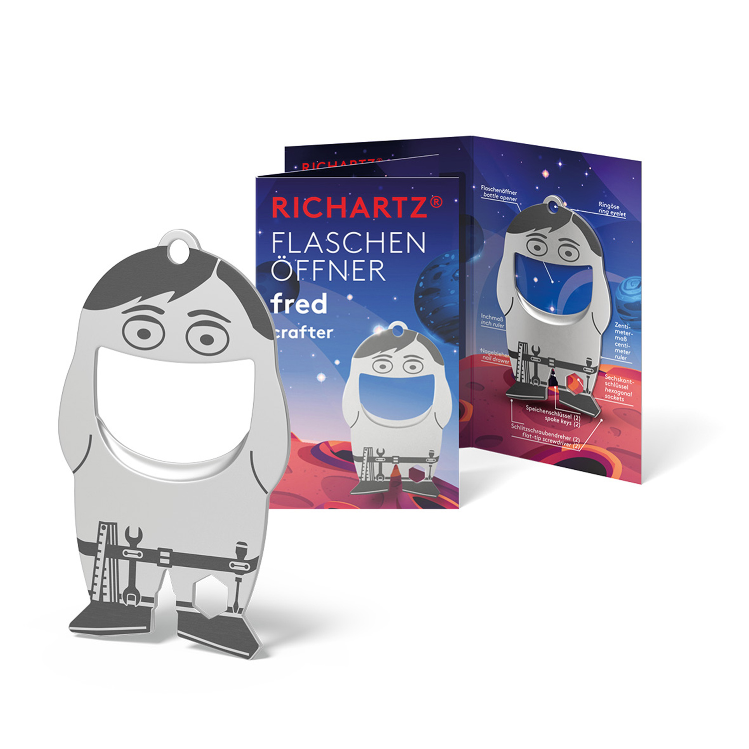 Der sympathische Flaschenöffner überzeugt durch seine schöne, kompakte Form und passt daher an jeden Schlüsselbund. Sein perfekt konstruierter Flaschen­öffner löst problemlos jeden Kronkorken und mit 9 weiteren nützlichen Funktionen wird er schnell zum unverzichtbaren Begleiter im Alltag. FLASCHENÖFFNER von RICHARTZ®: So praktisch und immer dabei!