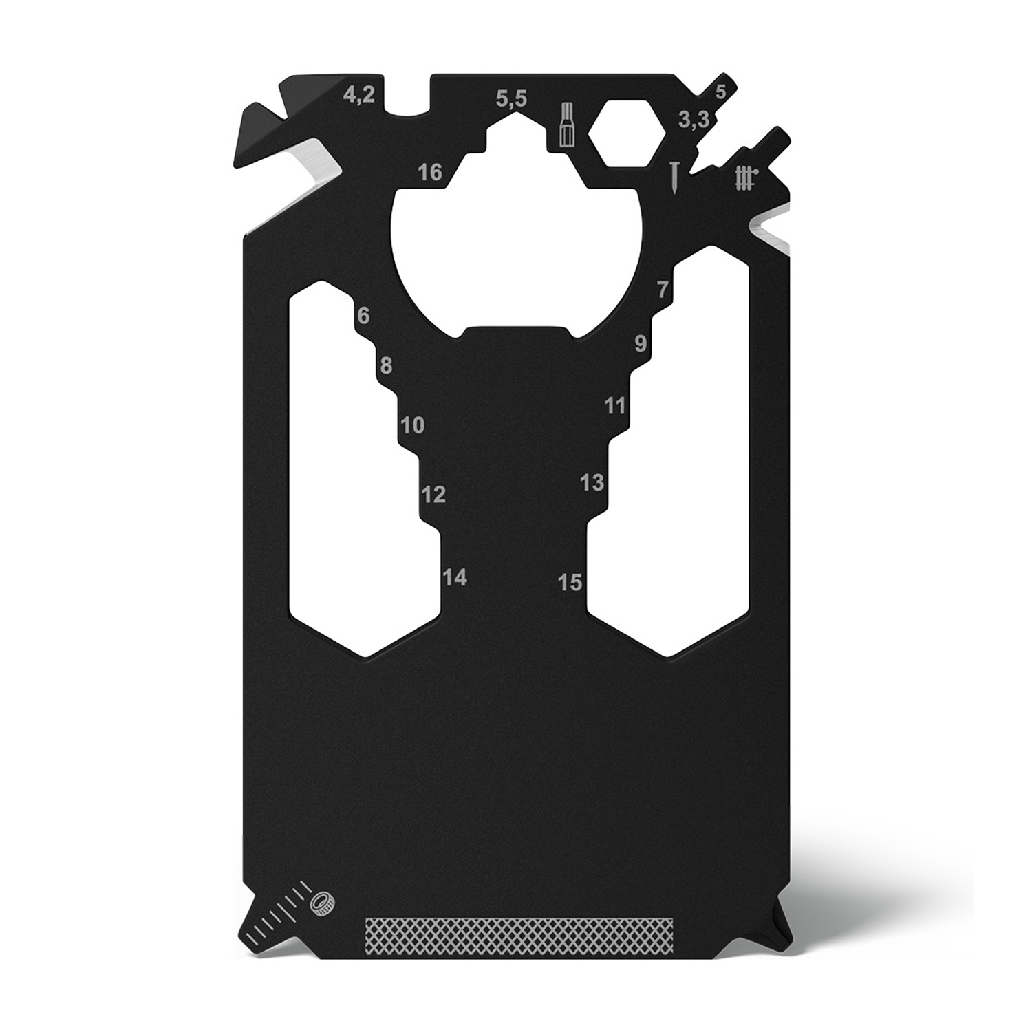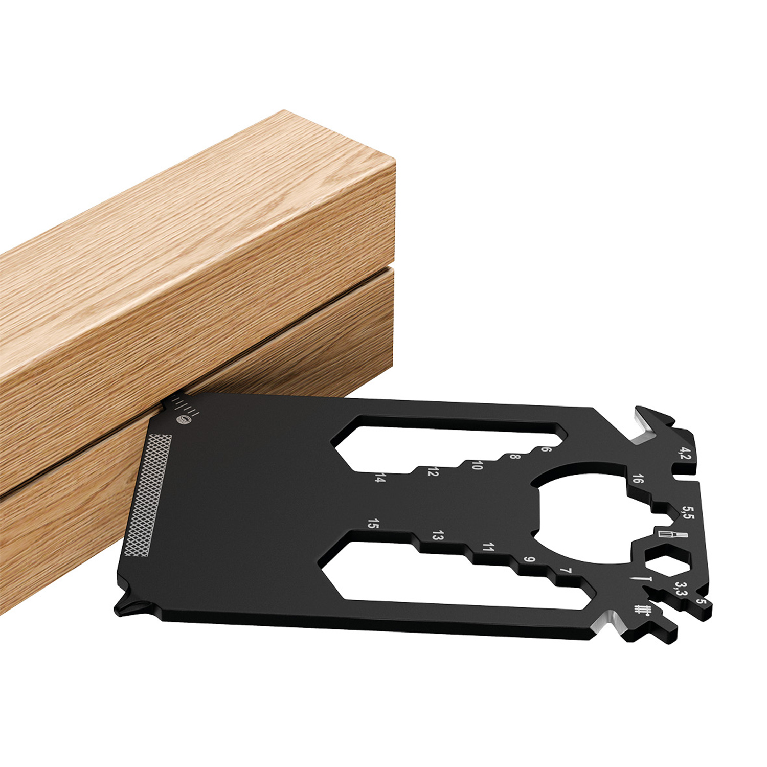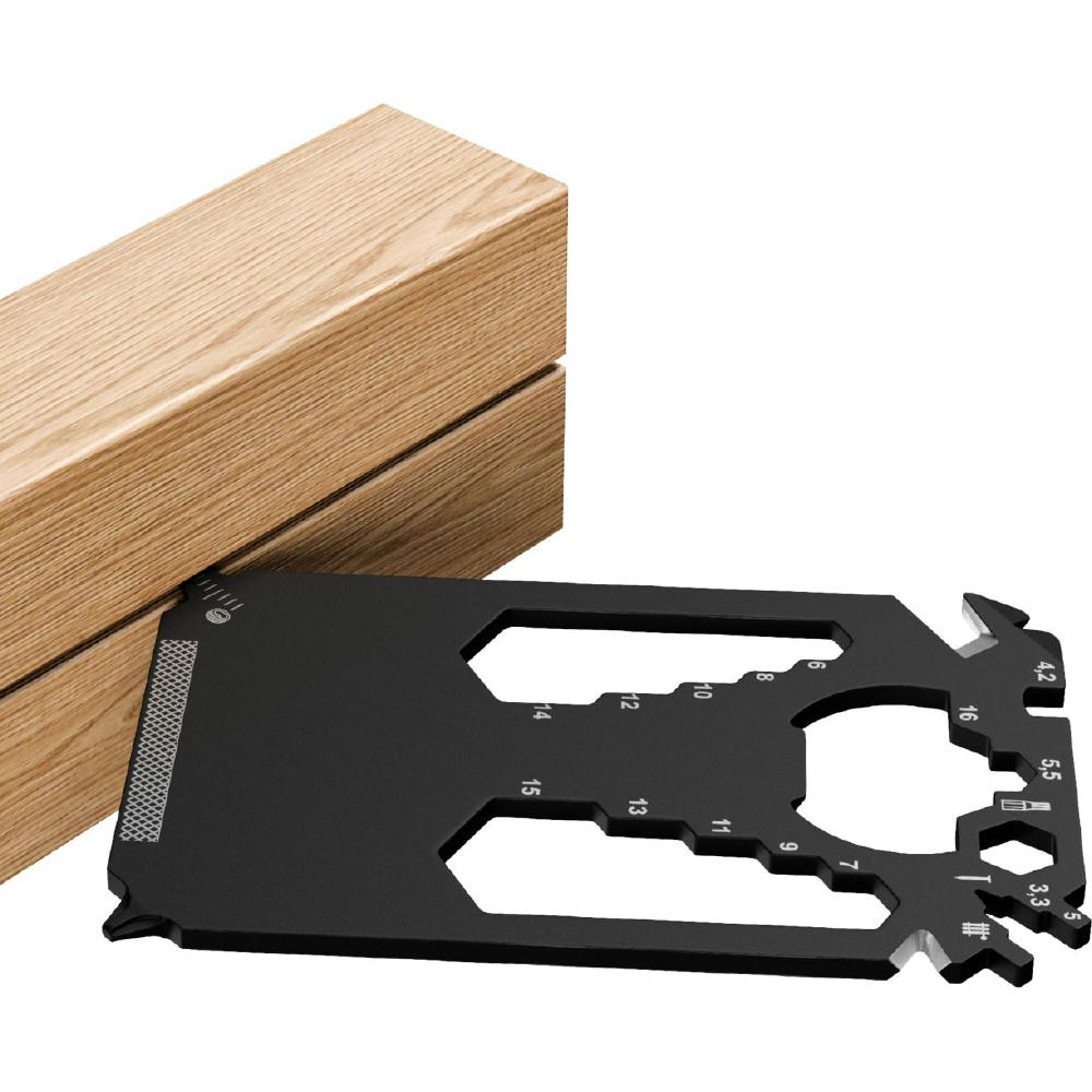 Scheckkartengroßes Multitool: Heizungsentlüftungsschlüssel, Speichenschlüssel (2), Nagelzieher, Bithalter, Stemmeisen, Brief- / Paketöffner, Kabelabisolierer, Sechskantschlüssel (12), Kapselheber, Zentimetermaß, Inchmaß, Kreuzschlitzschraubendreher, Nagelfeile, Winkelmesser, Schlitzschraubendreher, Profiltiefenmesser.