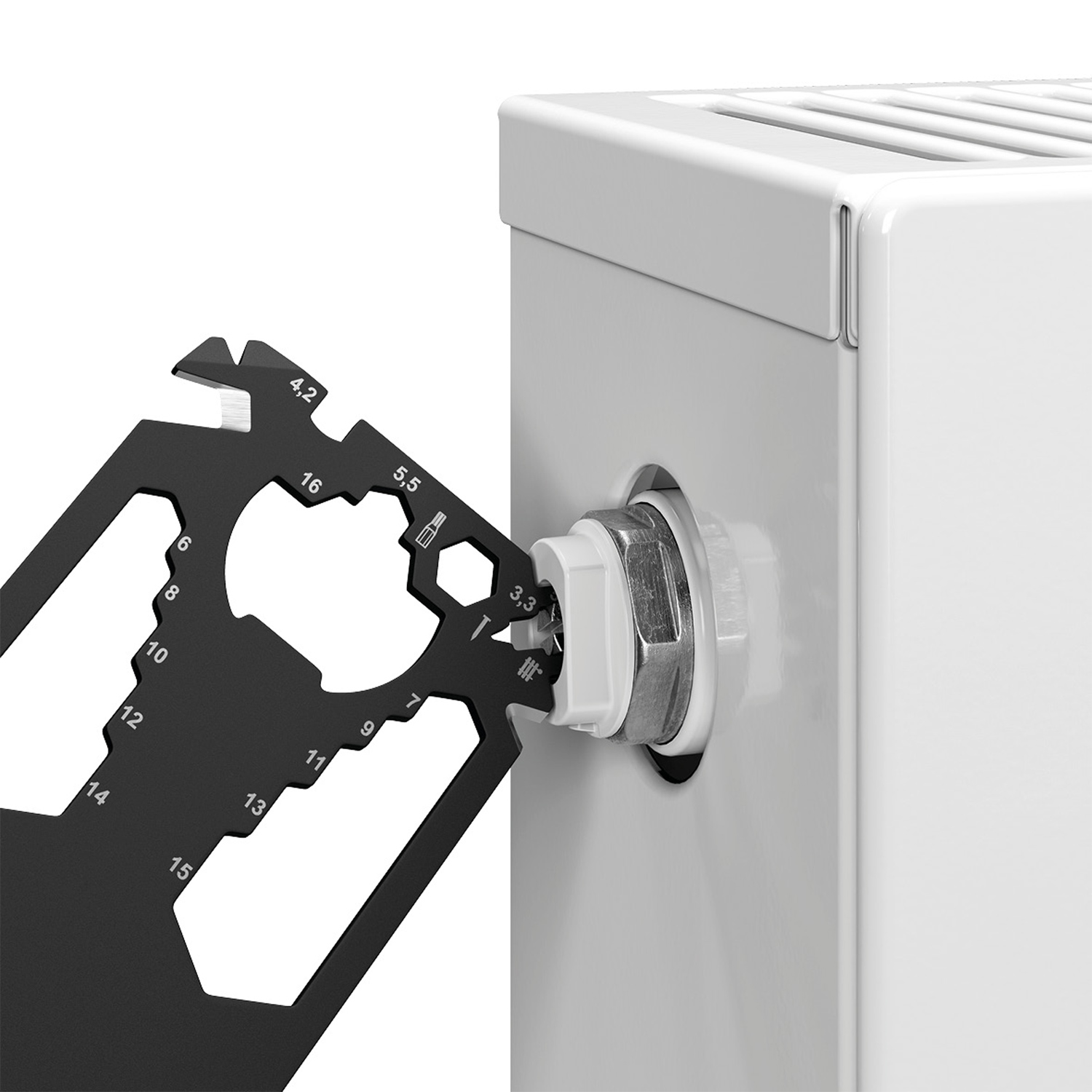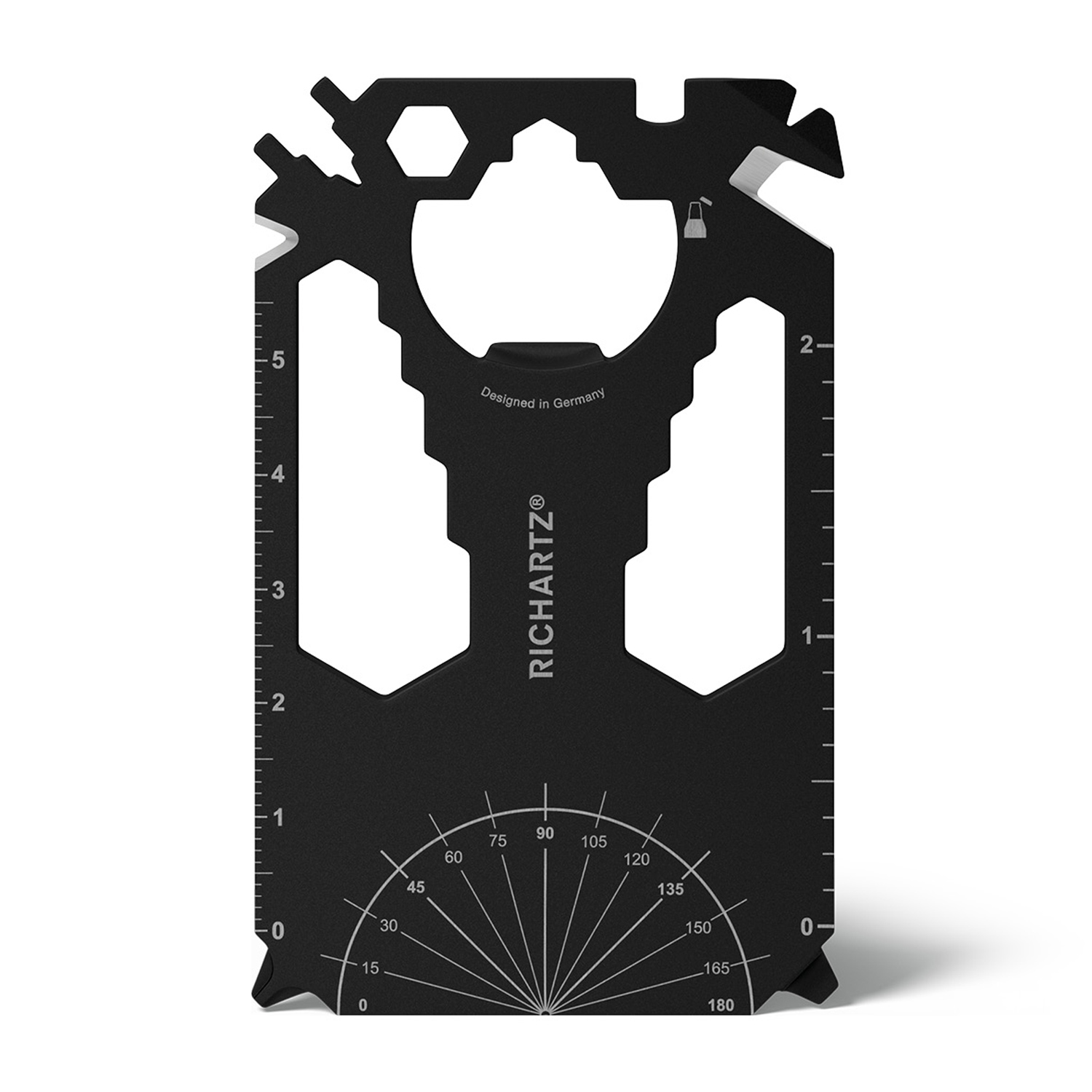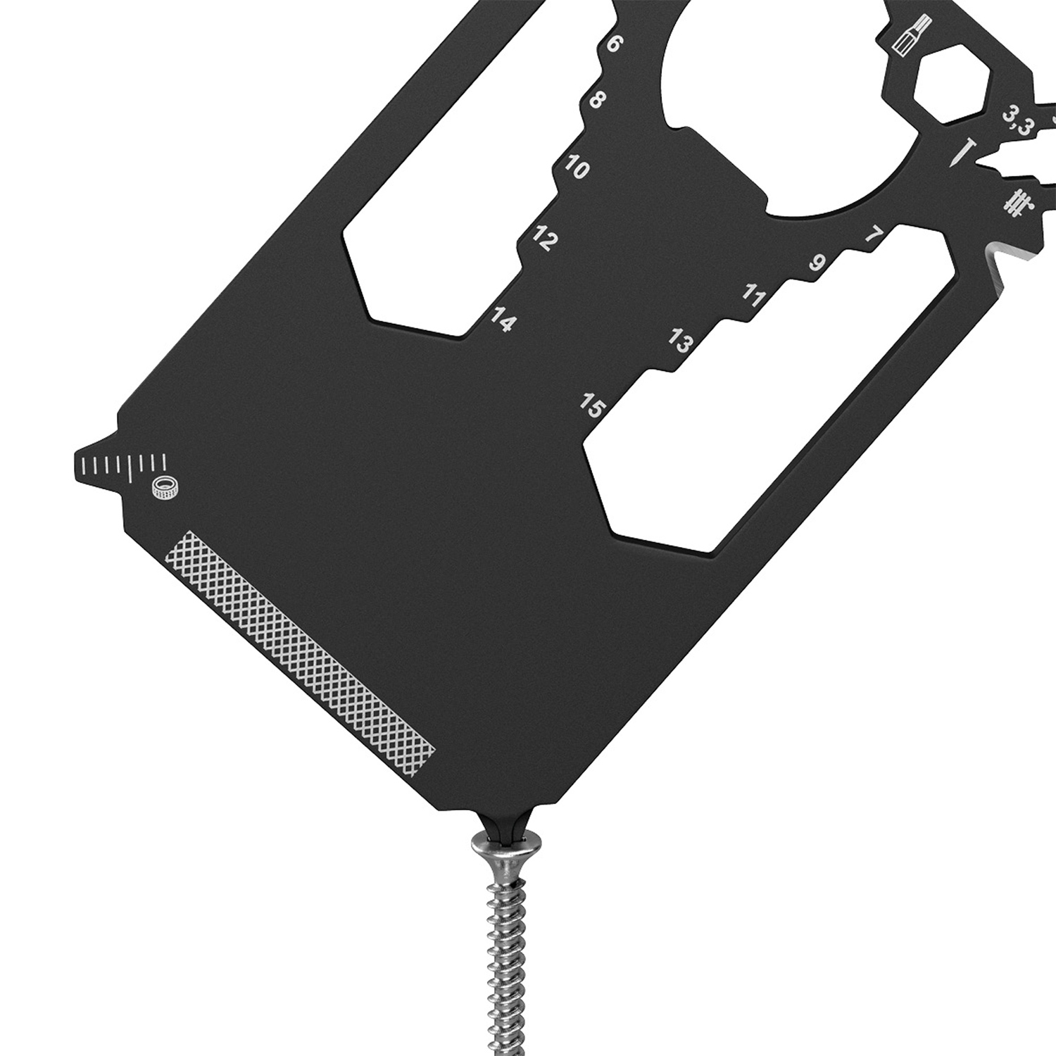 Scheckkartengroßes Multitool: Heizungsentlüftungsschlüssel, Speichenschlüssel (2), Nagelzieher, Bithalter, Stemmeisen, Brief- / Paketöffner, Kabelabisolierer, Sechskantschlüssel (12), Kapselheber, Zentimetermaß, Inchmaß, Kreuzschlitzschraubendreher, Nagelfeile, Winkelmesser, Schlitzschraubendreher, Profiltiefenmesser.