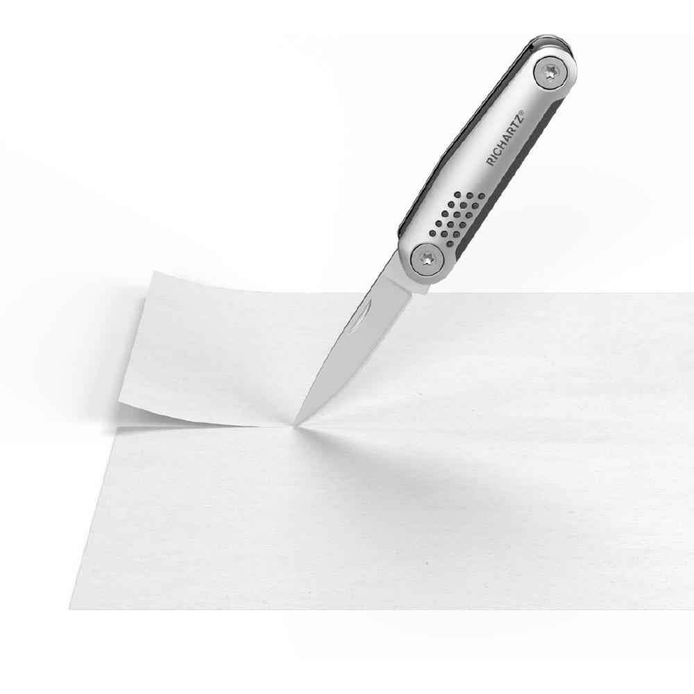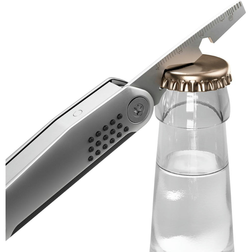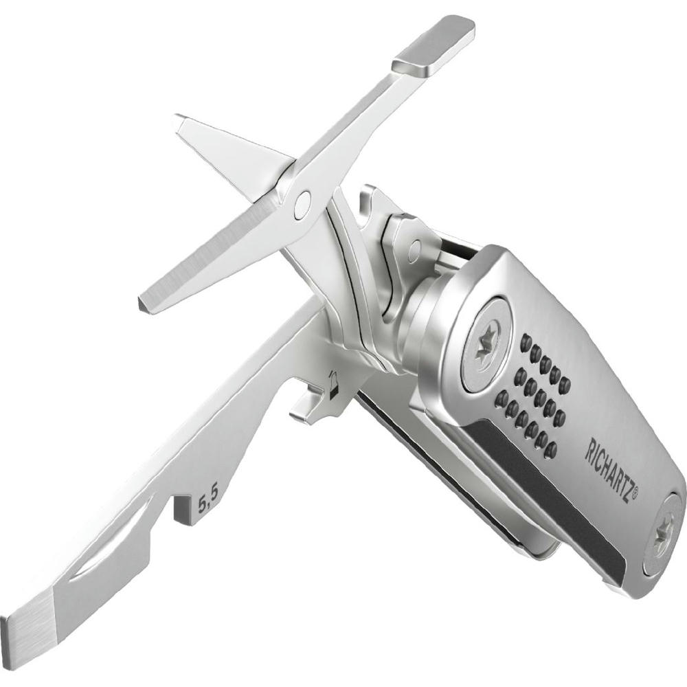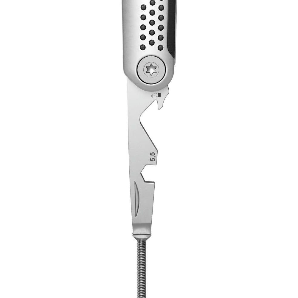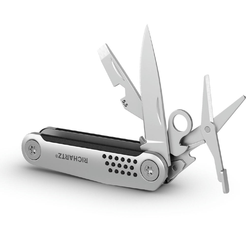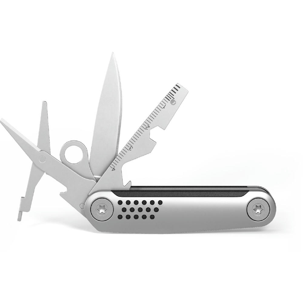 Die kompakte moderne Neuinterpretation des klassischen Taschenmessers mit 8 Funktionen: Klinge, Schere, Kapselheber, Schraubendreher, Sechskantschlüssel, Zentimetermaß, Profiltiefenmesser, Ringöse.