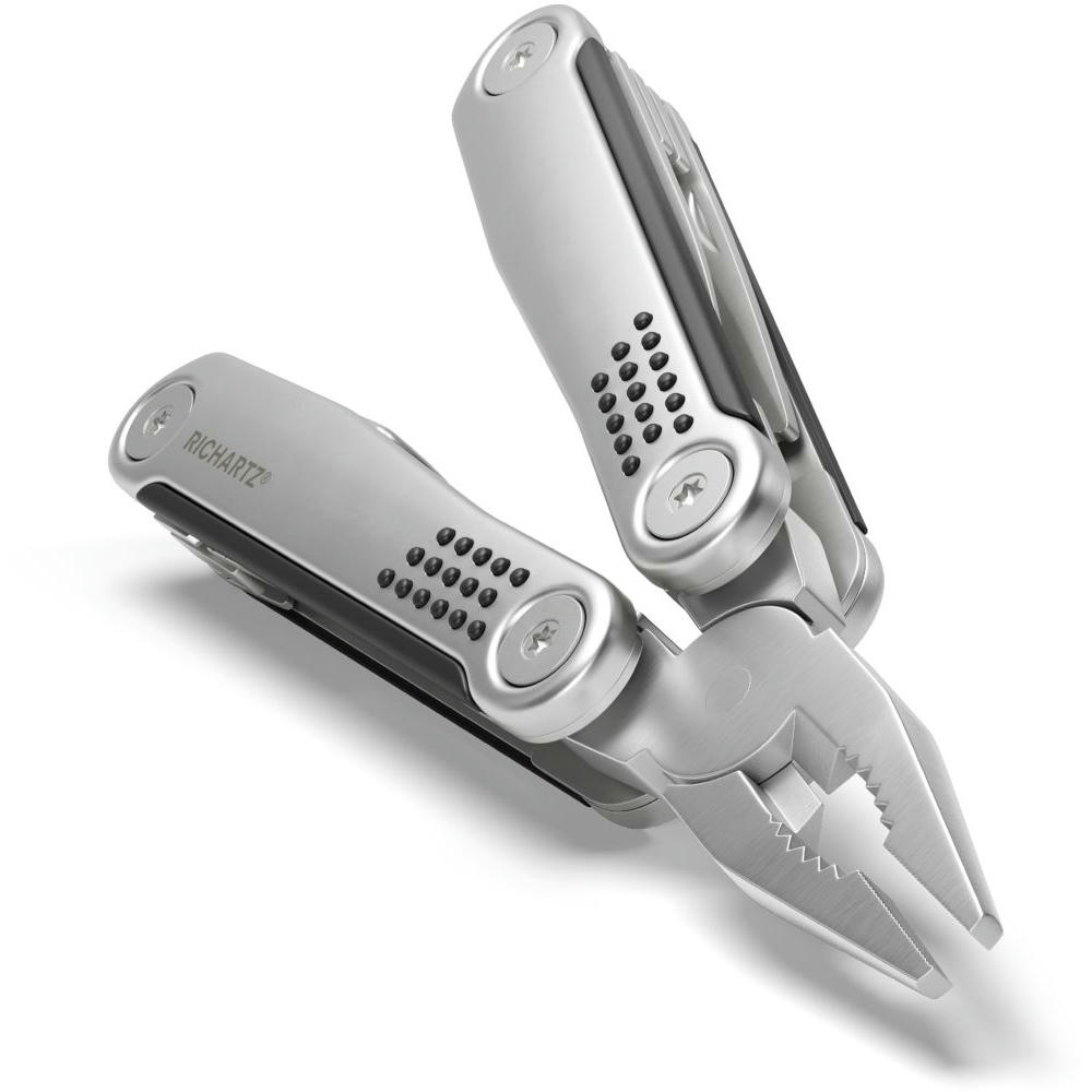 Alle ausklappbaren Funktionsteile sind einfach zu arretieren. Funktionen: Gegossene Zange, Drahtschneider, Schere, Glasbrecher, Bit-Satz mit 9 Bits, große Klinge, Säge, Kapselheber, Kreuzschlitzschraubendreher, Schlitzschraubendreher, Sechskantschlüssel, Fahrradspeichenschlüssel (2), Kabelabzieher, Nagelzieher, Zentimetermaß, Inchmaß. Ab 100 St. individuelle Gestaltung der Verpackung und Lasergravur auf dem Tool gegen Aufpreis möglich.