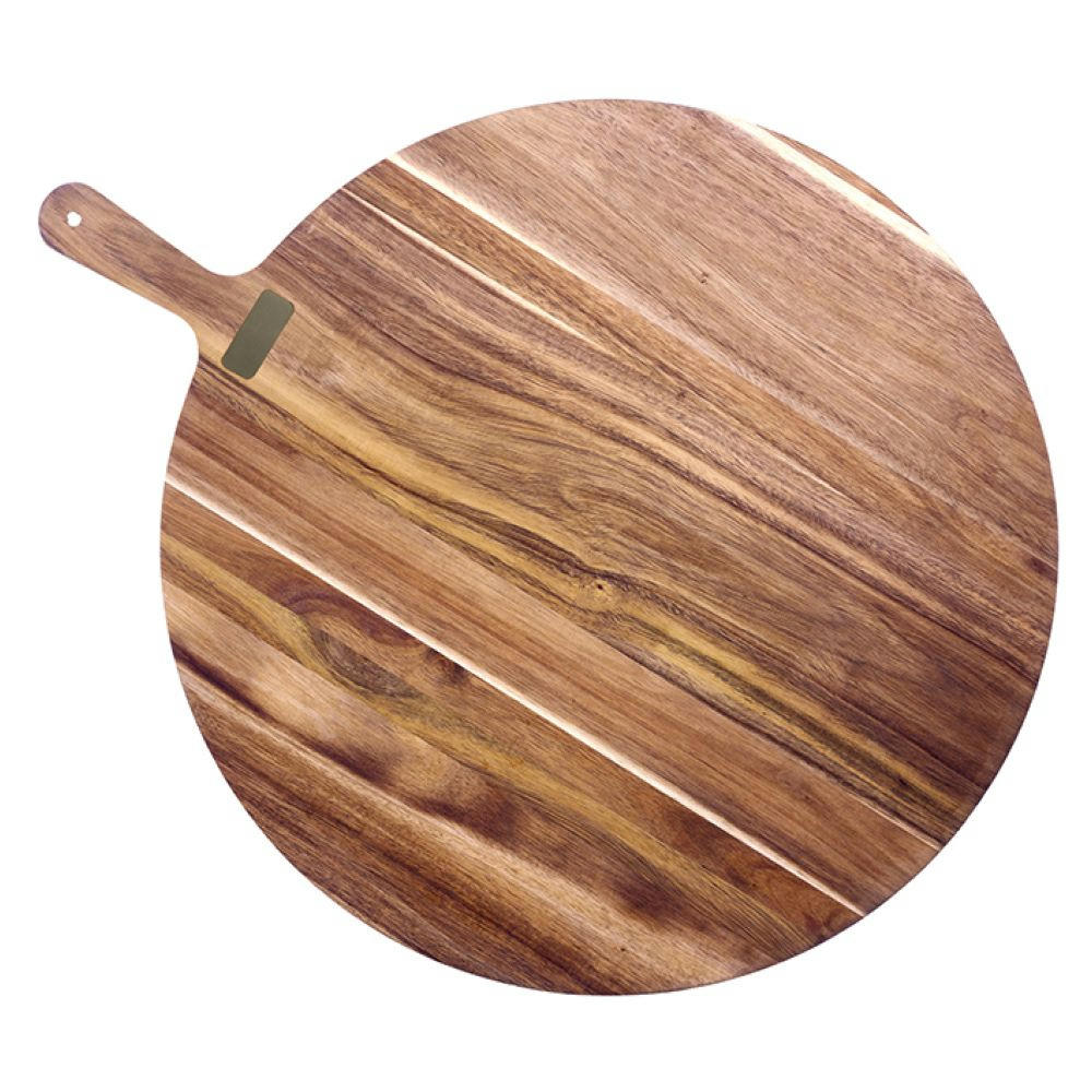 Massive Akazie. Metallplättchen mit Titan-Finish. Lederband. Kann auch als Präsentationsbrett verwendet werden. Akazie ist aufgrund seiner Härte und Feuchtigkeitsbeständigkeit für Schneidebretter perfekt geeignet.