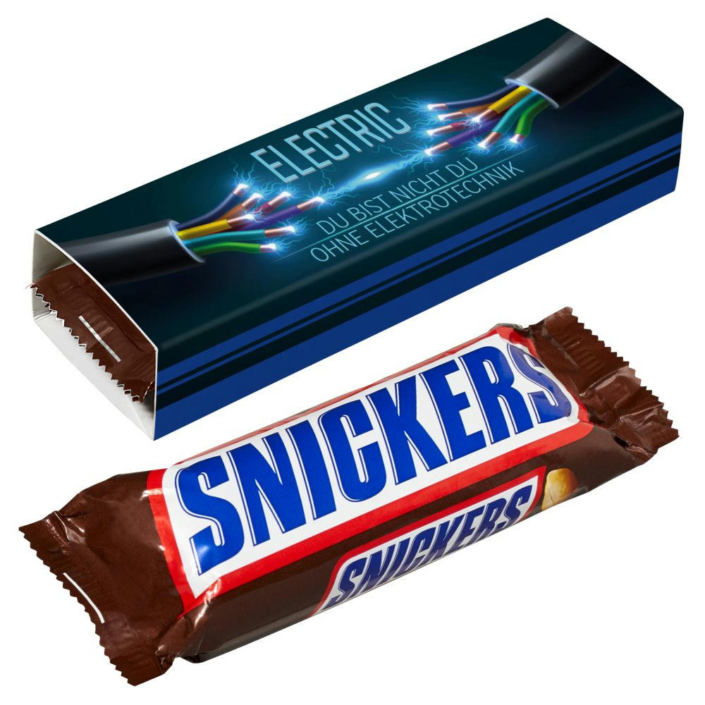 SNICKERS – Du bist nicht du, wenn du hungrig bist! Der meistverkaufte Schokoriegel weltweit. Vollgepackt mit Erdnüssen, Karamell und Nougat, umhüllt von leckerer Milchschokolade. Ideal als Messe- oder Meeting-Snack, für zwischendurch im Büro oder unterwegs. In handelsüblicher Ausführung mit Werbeschuber. Haltbarkeit: ca. 3 Monate bei sachgerechter Lagerung. Preis inkl. 1-4c Druck.