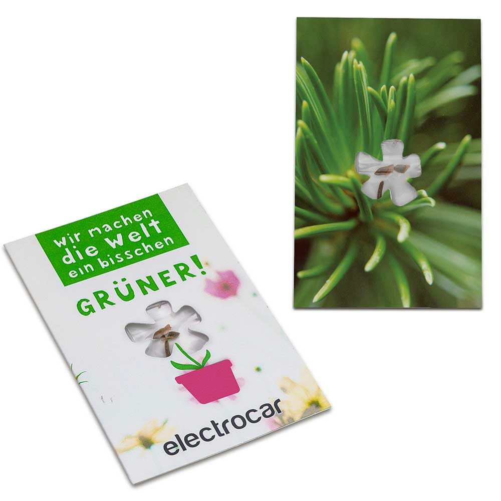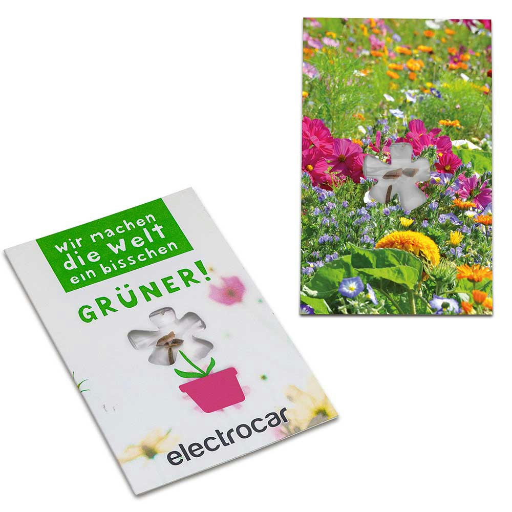 Ein sympathischer Werbe- und Mailingartikel, bei dem der Empfänger direkt sieht, was er bekommt: Ein Sichtfenster in Blumenform greift das Frühlingsthema spielerisch auf und man sieht die Pflanzensamen, die sich lose im Tütchen hin und her bewegen und Lust aufs Gärtnern machen. Die Karte im Scheckkartenformat ist beidseitig gestalt- und bedruckbar und ist der optimale Werbeträger.