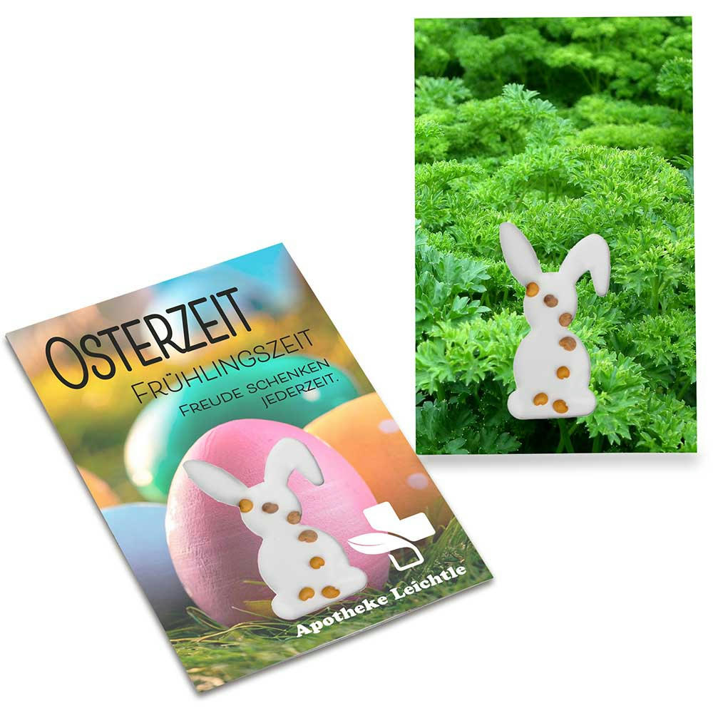 Der Hase lässt die Ohren hängen, doch die Werbewirkung ist stark. Dieser sympathische Werbe- und Mailingartikel vermittelt auf Anhieb, worum es geht: Ein Sichtfenster in Hasenform greift das Oster-Thema auf und zeigt die Pflanzensamen – entweder die Samen des Eierbaumes oder wahlweise weitere Samensorten. Diese bewegen sich locker im Tütchen und wecken die Lust aufs Gärtnern. Die Karte im praktischen Scheckkartenformat lässt sich beidseitig individuell gestalten – der perfekte Werbeträger für die Frühlingssaison.
