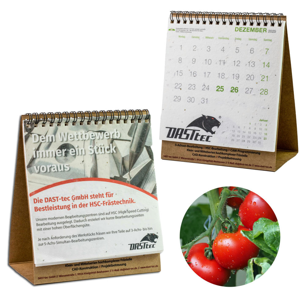 In einer hektischen Welt, in der wir uns oft von der Natur entfremden, ist es wichtiger denn je, sie in unseren Alltag zu integrieren. Unser Samenpapier Tischkalender bietet eine einzigartige Verbindung zwischen Funktionalität und Naturverbundenheit. Der Fuß besteht aus Kraftpapier, die Vorder- und Rückseite werden individuell bedruckt. Die erste Seite der 7 Samenpapier-Blätter wird vollflächig individuell bedruckt. Auf den Monatsseiten ist jeweils ein Druckfeld in der Größe von 92 x 37 mm individuell bedruckbar (ein Motiv für alle Seiten).Alle 7 Samenpapierseiten enthalten denselben Samen. Zur Auswahl stehen die Samen von Minze, Lavendel, Kamille, Rudbeckia, Mohn, Gänseblümchen, Wildblumenmischung, Karotte oder Tomate. Wenn das Kalenderblatt nicht mehr benötigt wird, kann es eingepflanzt werden und man schenkt seiner Umgebung eine kleine, grüne Oase des Glücks und der Achtsamkeit.