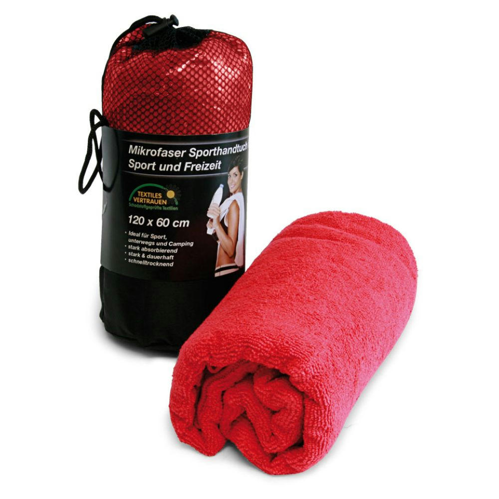 Mittelgroßes Sporthandtuch aus 85% Polyester und 15% Polyamid (Mikrofaser-Frottee 280 g/m²)stark absorbieren und schnell trocknend, in einem schwarzen Netzbeutel mit Infobanderole, die auf Wunsch selbst gestaltet werden kann.