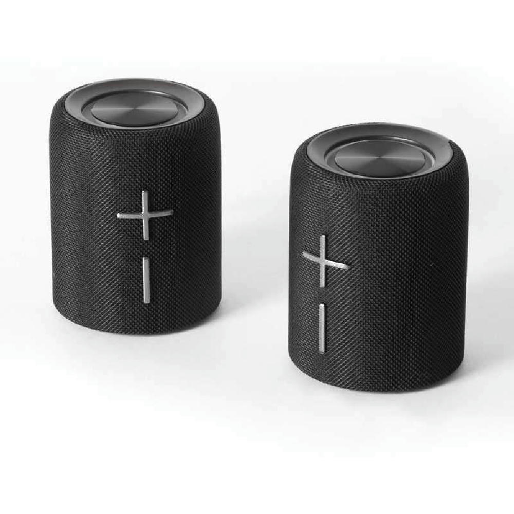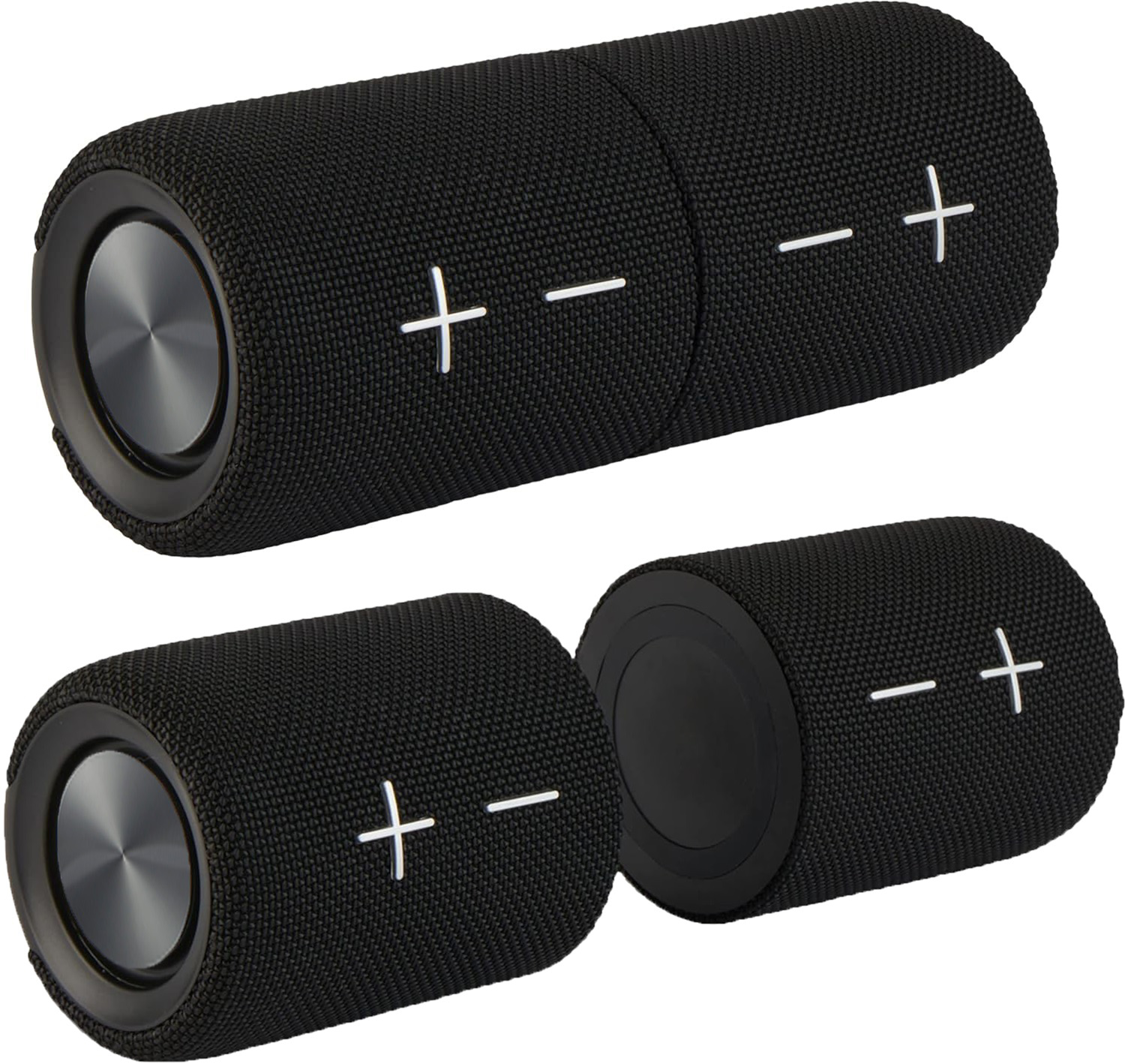 Kraftvoller 2x10W Sound (RMS), - ob mit Magnet verbunden - oder geteilt auf dem Schreibtisch. Mit IPX6 Strahlwasserschutz. Batterie: 2 x 1500mAh, Ladedauer: ca. 2 Stunden, Spielzeit: ca. 5-6 Stunden bei 50% Lautstärke.
