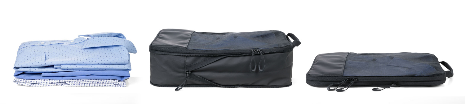 Dreiteilig für verschiedene Kleidungsstücke: Größe L für Hemden & Hosen, Größe M für Shirts und Größe S für Socken und Wäsche – platzsparend, geordnet und knitterfrei. Durch verschließen des Netzfach-Reißverschlusses wird der Inhalt vollständig komprimiert.