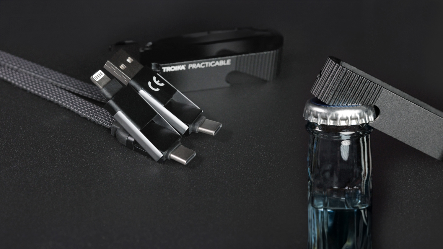 Schnellladekabel mit Flaschenöffner für unterwegs, USB/USB-C auf Lightning oder USB-C, mit Datenübertragungsfunktion, Kabel textilummantelt.