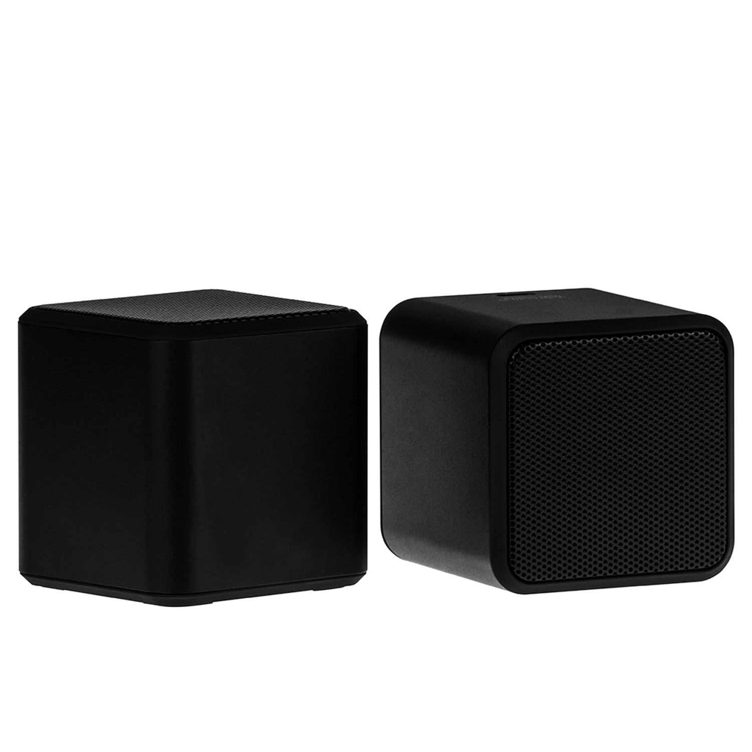 **Stereo Total!** Twinspeaker besteht – wie der Name schon suggeriert – aus zwei unabhängigen, kleinen Lautsprechern, die für satten, kabellosen **2 x 3 Watt** Stereo-Sound sorgen. Egal wo sie sind. Durch die Auto-Stereo Kopplung und zusätzlichen Steuerelementen auf jedem der „Twins“ ist die Bedienung genauso einfach und intuitiv, wie Sie es von einem Bluetooth Speaker gewohnt sind. Freisprechfunktion inklusive. Für einen perfektes, räumliches Klangerlebnis – zum Beispiel bei einem spannenden Blockbuster – richten Sie die beiden kubischen Lautsprecher ganz nach Belieben und unabhängig voneinander aus. Ihr Logo als elegante Gravur oder brillantem Druck auf dem matt-schwarzen Aluminiumgehäuse ist hier gleich doppelt im Sichtfeld ihrer Kunden. * Ladekabel inklusive * Akku Lithium 2 x 400 mAh * Bluetooth 4,2 / JL * Reichweite 10m * Zertifikate CE, ROHS