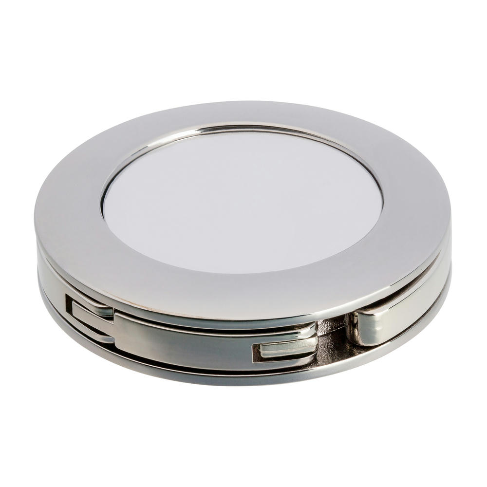 Der silberne Taschenhaken aus Metall hat eine kreisrunde, weiß abgesetzte Veredelungsfläche auf der Vorderseite, die sich für ein ausdruckstarkes Doming anbietet. Zusätzlich wird dem Artikel eine Aluminiumplatte beigefügt, die für eine Veredelung mit Lasergravur genutzt werden kann.
