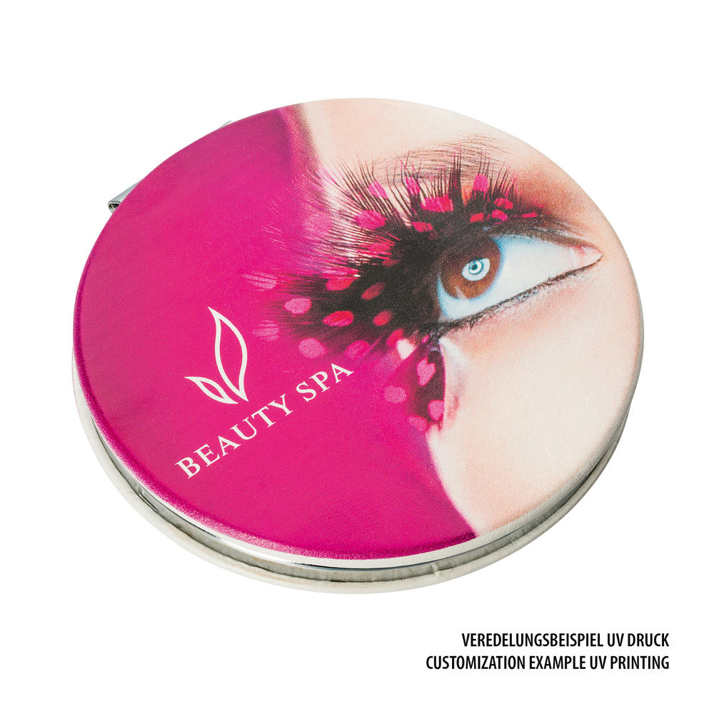 Machen Sie aus diesem Doppel-Kosmetikspiegel (Vergrößerung 2fach) Ihr Unikat. Die Kunstleder-Oberfläche ist per UV-Print mit Ihrem fotorealistischen Motiv wirkungsvoll und unnachahmlich veredelbar.