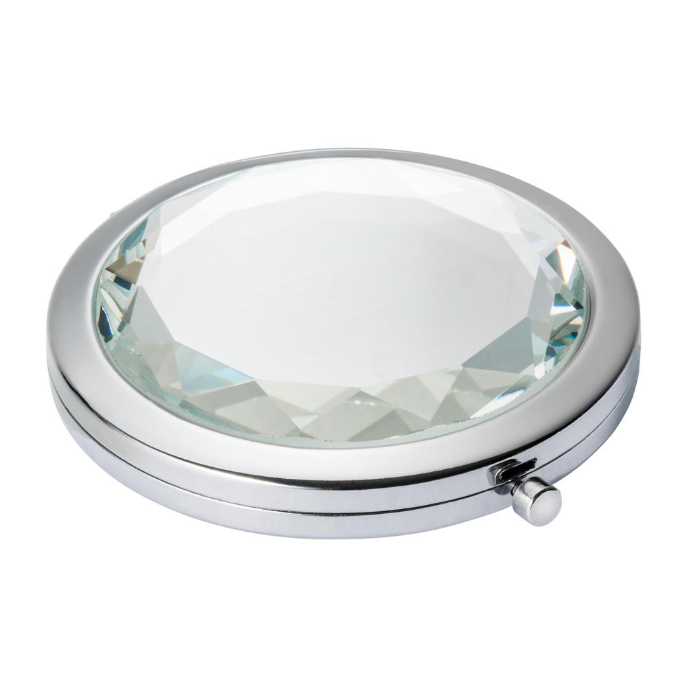 Taschenspiegel mit schmuckvoll geschliffenem Glasdeckel. Die Glasoberfläche kann per Druck mit einem Logo veredelt werden und wirkt durch die Spiegeloptik besonders reizvoll. Lieferung im schützenden Samtsäckchen.