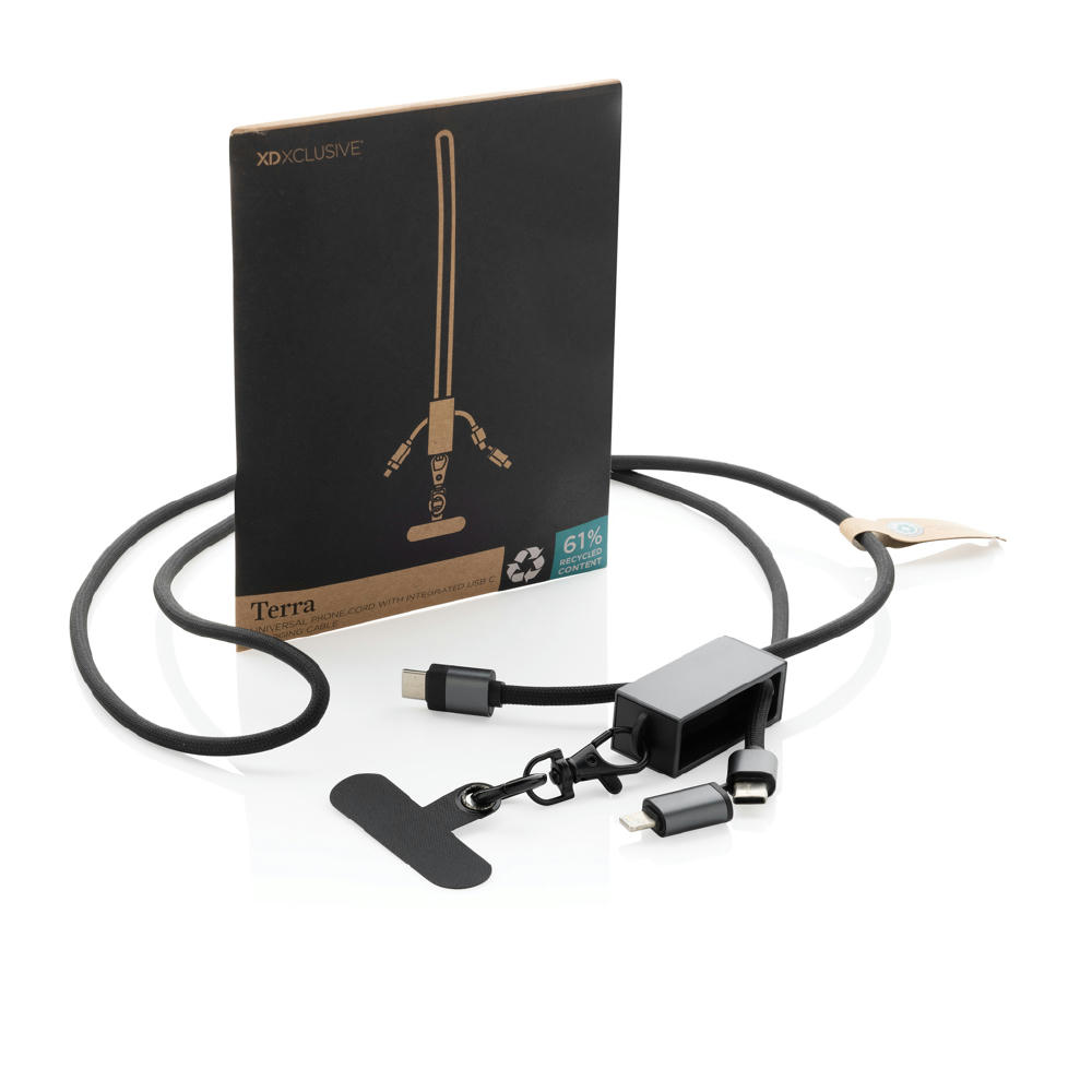 Bleiben Sie geladen mit dem Terra Universal Phone Cord. Dieses vielseitige Zubehör kombiniert den Komfort eines Schlüsselbands mit der Funktionalität eines leistungsstarken Lade- und Datenkabels. Dieses universelle Kabel ist ideal für alle, die viel unterwegs sind, denn es unterstützt sowohl USB-C- als auch iOS-Geräte und ist somit ideal für Nutzer mehrerer Geräte. Type-C-Eingang mit Dual Type-C & iOS-Output, damit Sie eine Vielzahl von Geräten aufladen können. Genießen Sie eine Leistungsabgabe von bis zu 60 W (Type-C zu Type-C) und laden Sie Ihr Gerät mit einer maximalen Stromstärke von 20V/3A auf, um es schneller aufzuladen. Synchronisieren Sie Daten und genießen Sie die Kompatibilität mit Android Auto ( nur Type-C zu Type-C). Gesamter recycelter Inhalt: 61% basierend auf dem Gesamtgewicht des Artikels. Die RCS-Zertifizierung gewährleistet eine vollständig zertifizierte Lieferkette für die recycelten Materialien. Verpackt in einer plastikfreien Umschlagverpackung. PVC-frei.