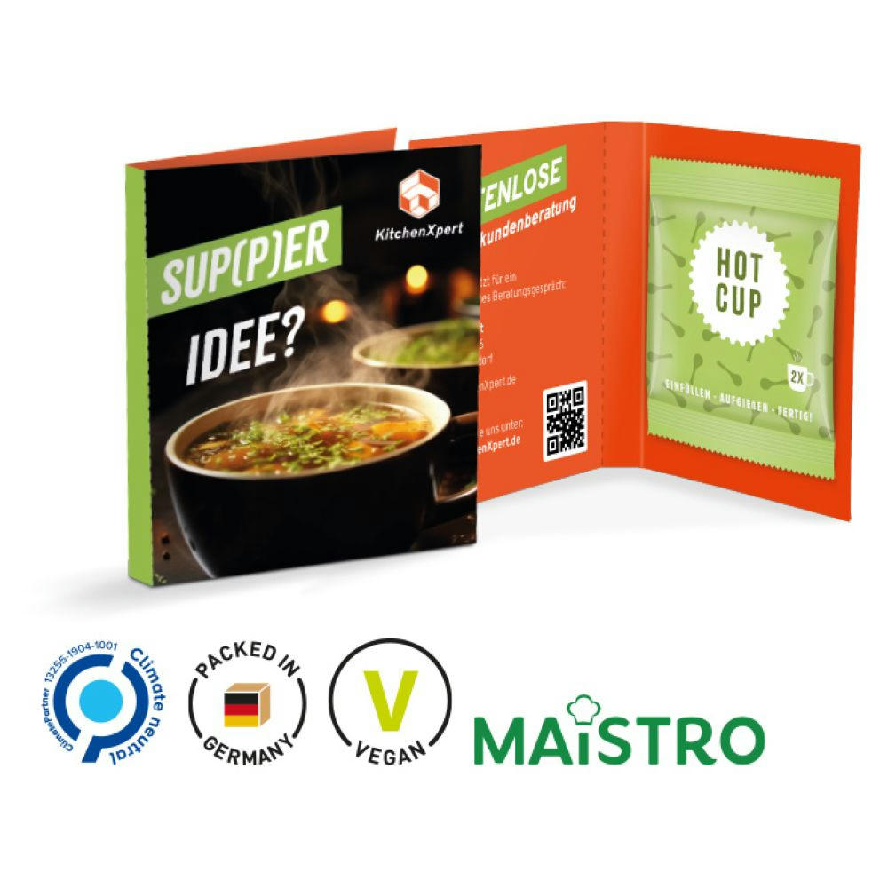 Werbekarte Midi aus weißem Karton und mit praktischer Abreißperforation, gefüllt einer Minitüte Maistro "MEINE KLARE SUPPE" mit Standardgestaltung, individell bedruckt. Haltbarkeit 5 Monate. Inkl. 4-c Druck.