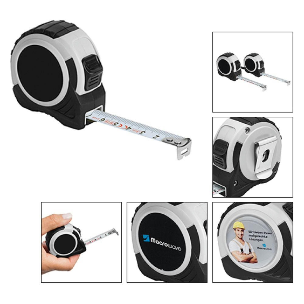 Bandmaß mit Bandfeststellmechanismus, dynamischem Bandrücklauf, beweglichem Bandanfangshaken, Gürtelclip, Gummihandschlaufe. Gehäuse: schlagfestes 2-Komponenten-Gehäuse aus ABS und TPR. Knickfestigkeit: 1,40 m. Skalierung: cm, einseitig.