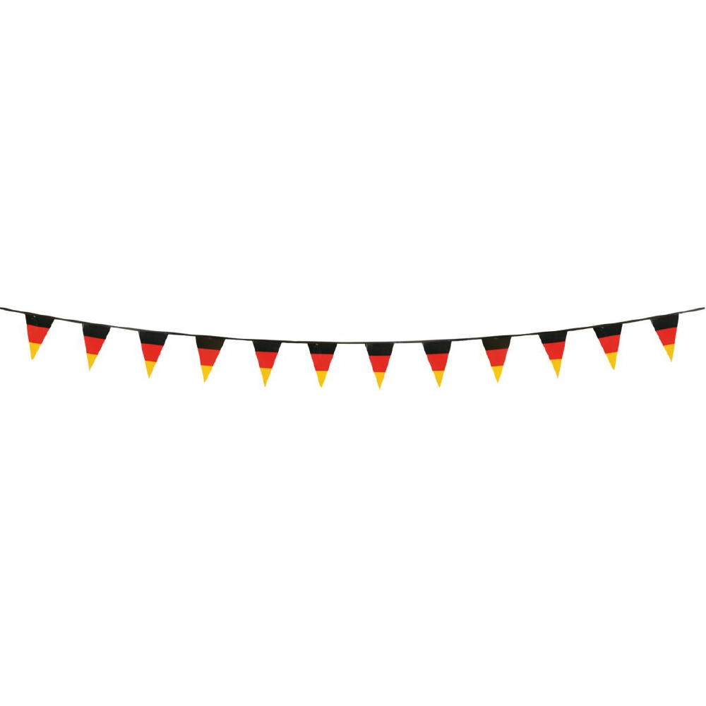 Zum Dekorieren das perfekte Accessoire. 5 m lange Kette mit 12 dreieckigen Wimpeln (20 x 30 cm), die horizontale Streifen in schwarz, rot und gelb haben.